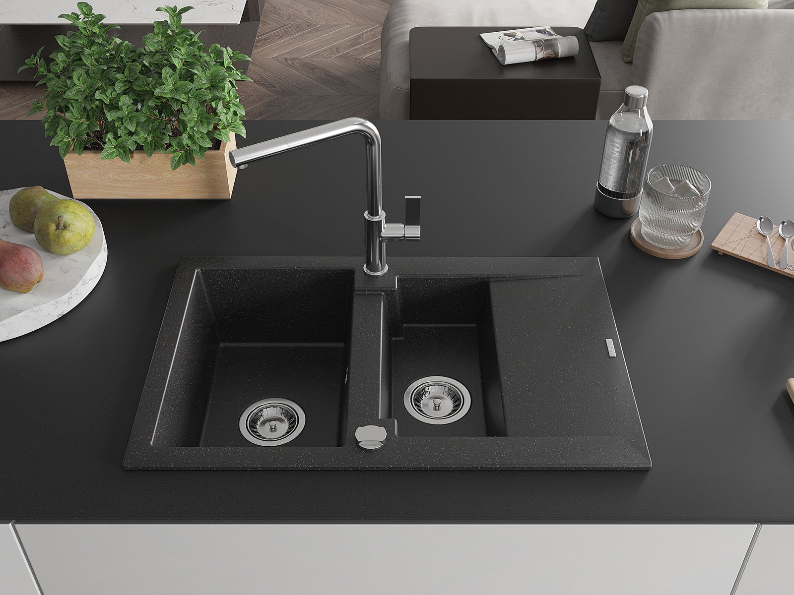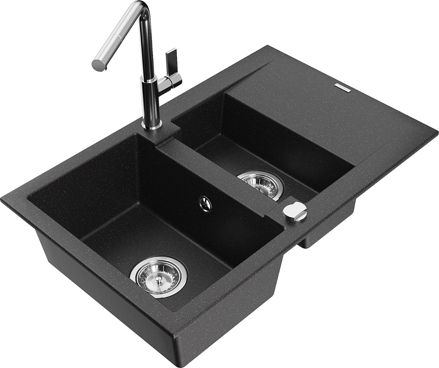 Mexen Gaspar granitinė 1,5 kameros plautuvė su nusausinimo ir virtuviniu maišytuvu Flora, juoda/sidabrinė - 6507-73-670401-00