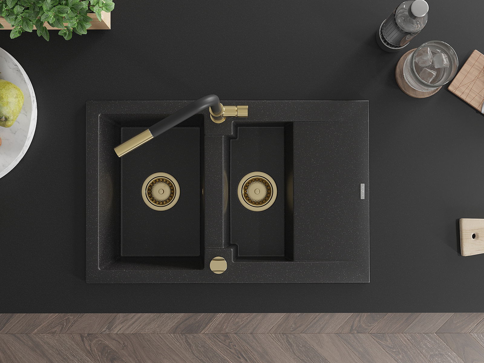 Mexen Gaspar granito plautuvė 1,5-dalių su drenažu ir virtuviniu maišytuvu Flora, juoda/sidabrinė - 6507-73-670401-57-G