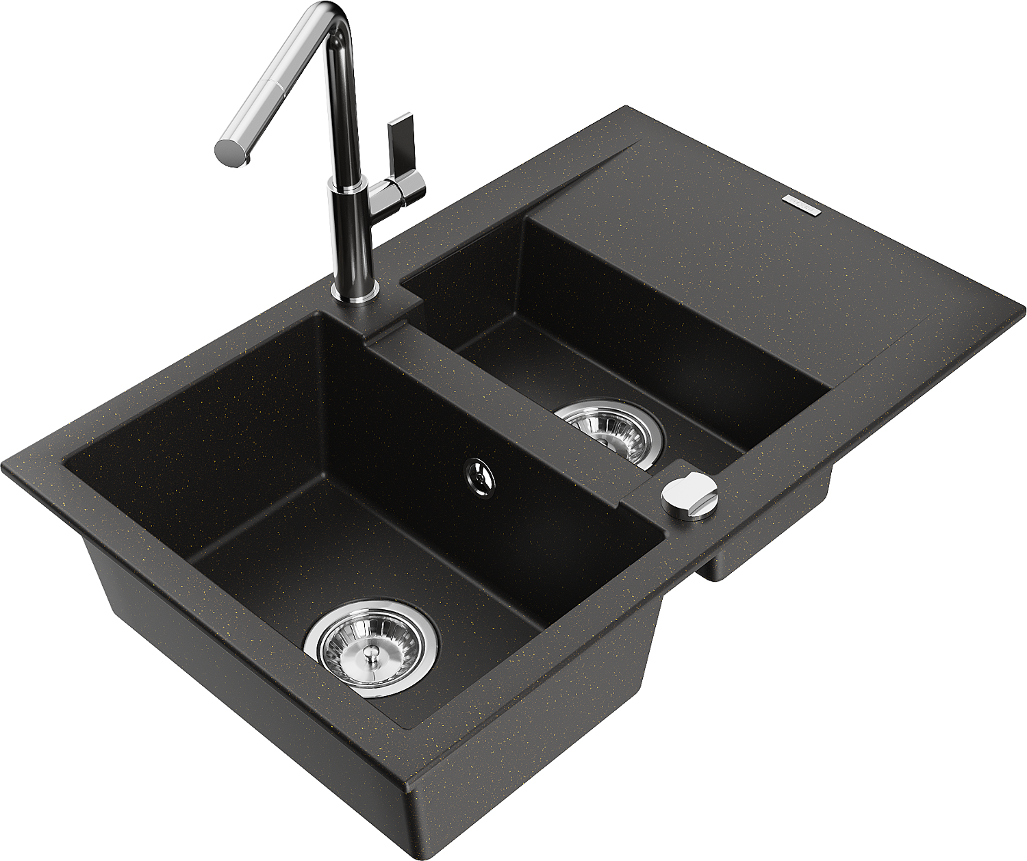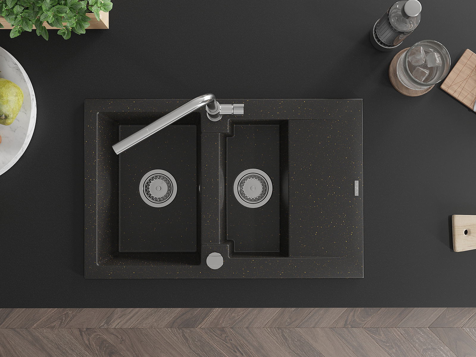 Mexen Gaspar granitinė 1,5 dubens kriauklė su drenažu ir Flora virtuviniu maišytuvu, juoda/auksinė metalinė