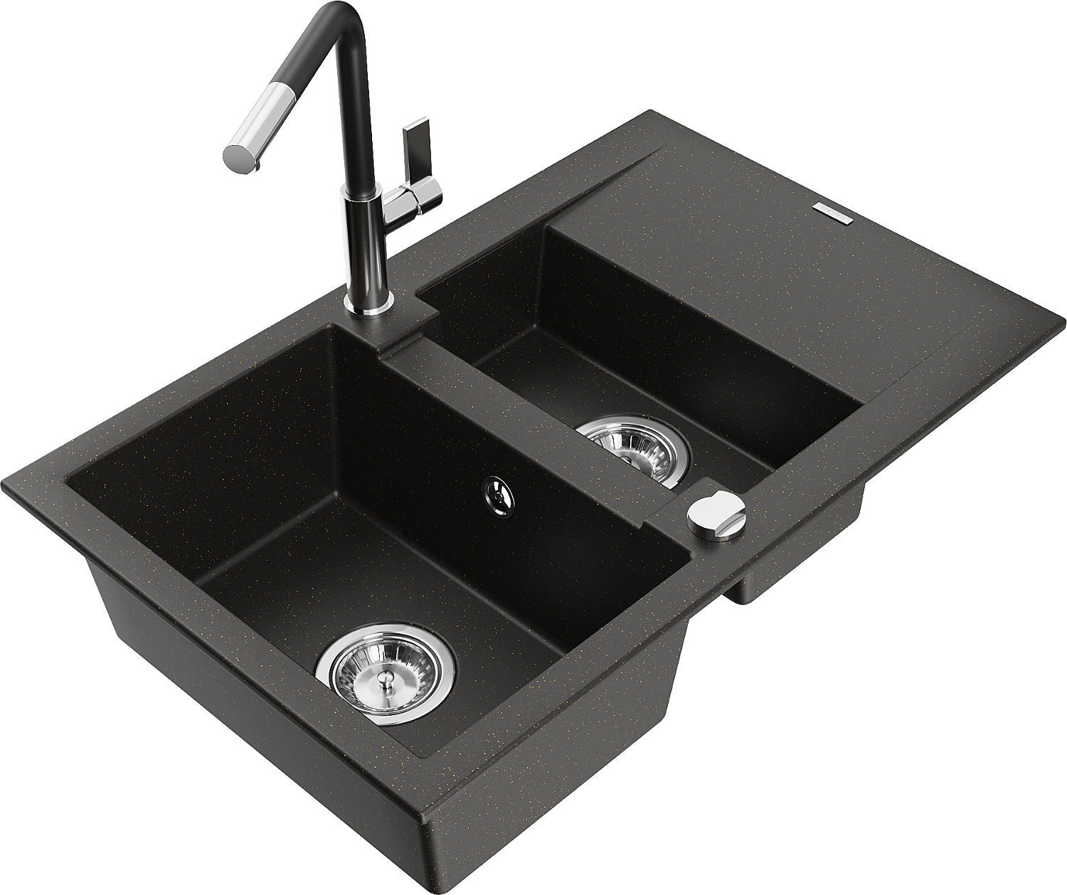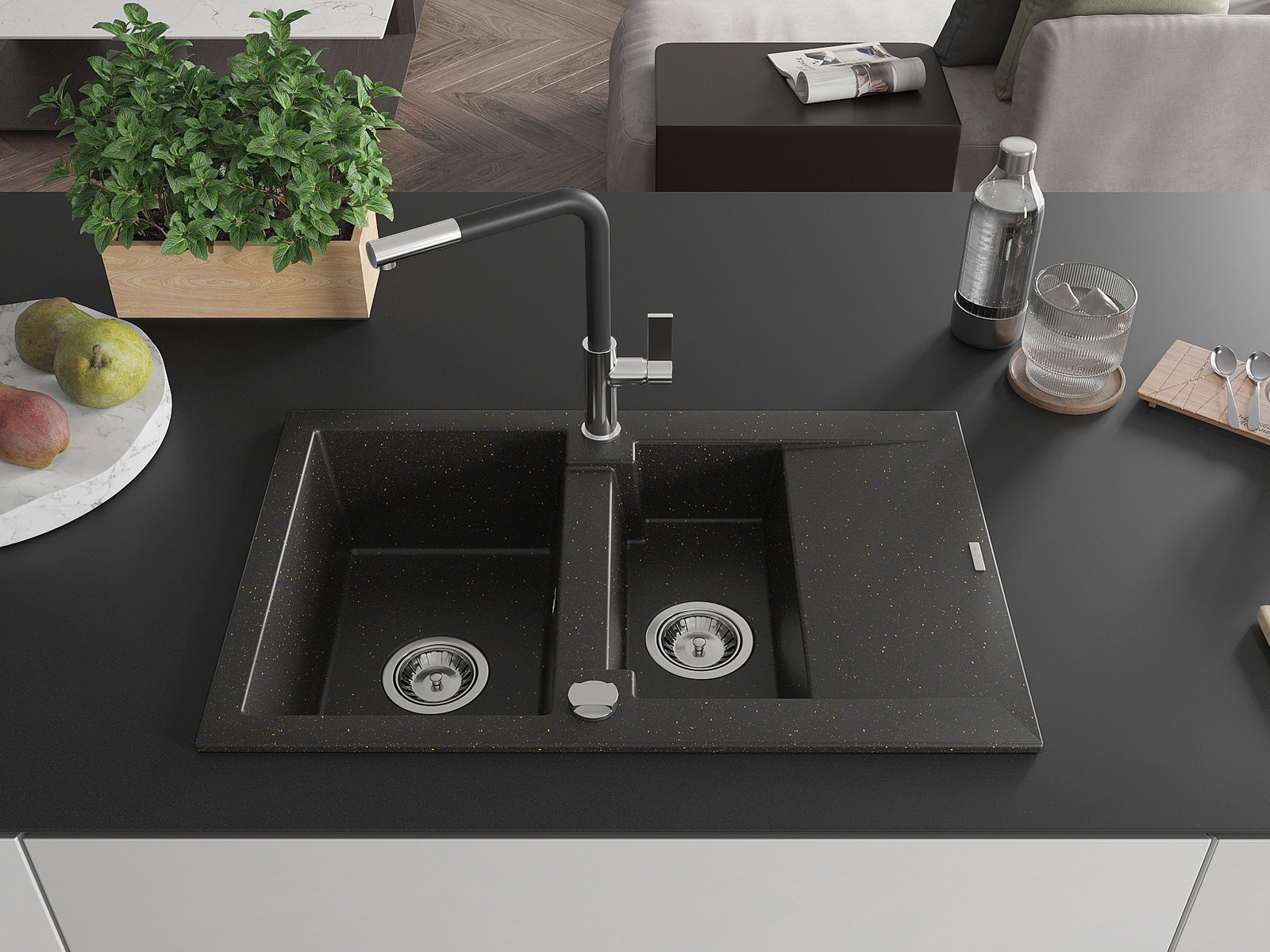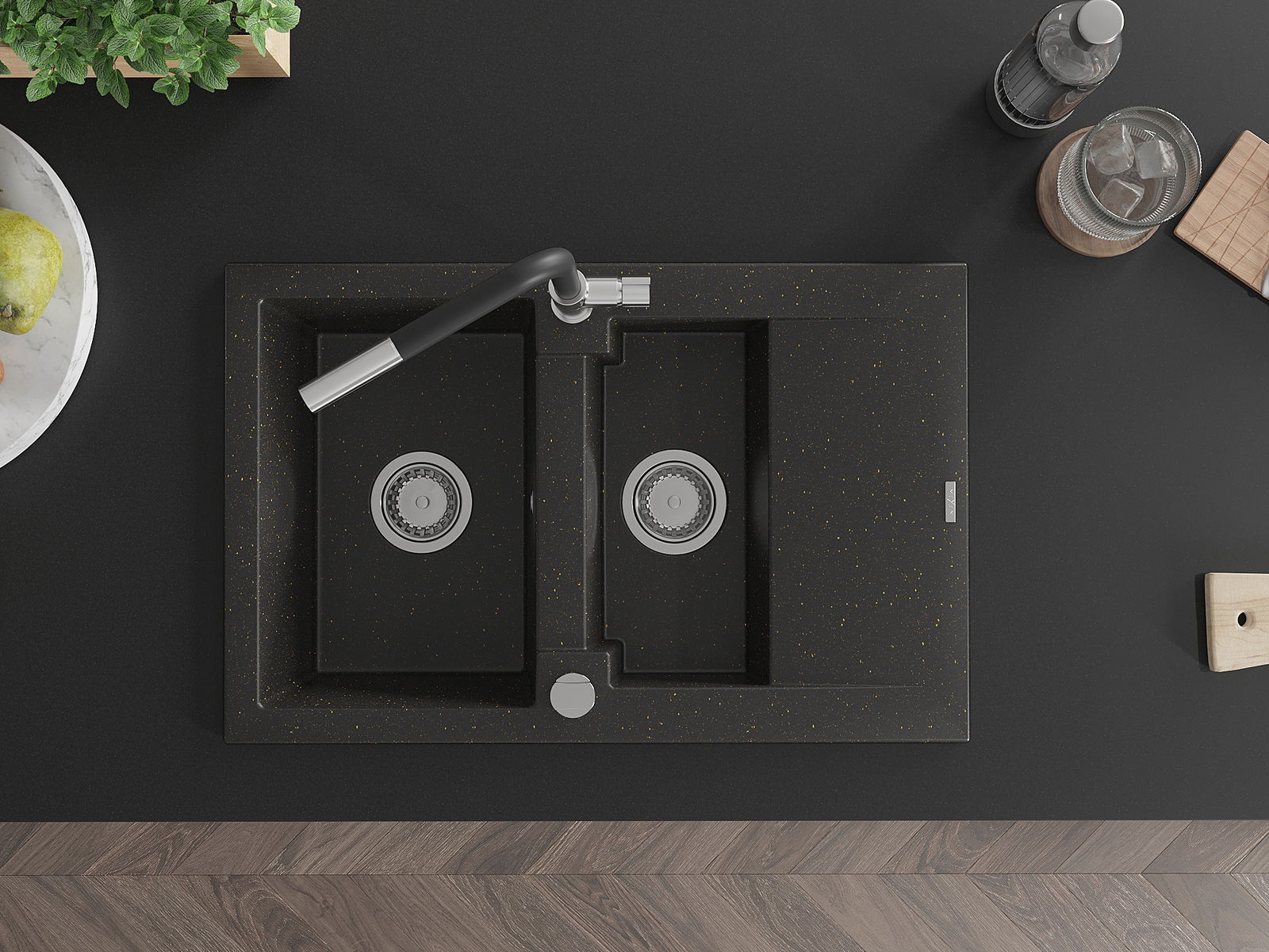 Mexen Gaspar granitinė kriauklė su 1,5 dubenėlėmis ir nusausinimo vieta bei virtuviniu maišytuvu Flora, juoda/auksinė