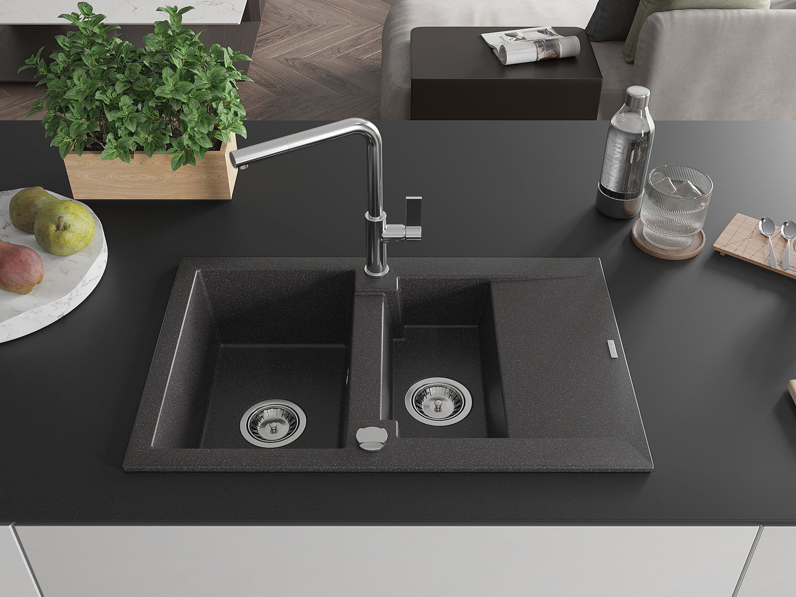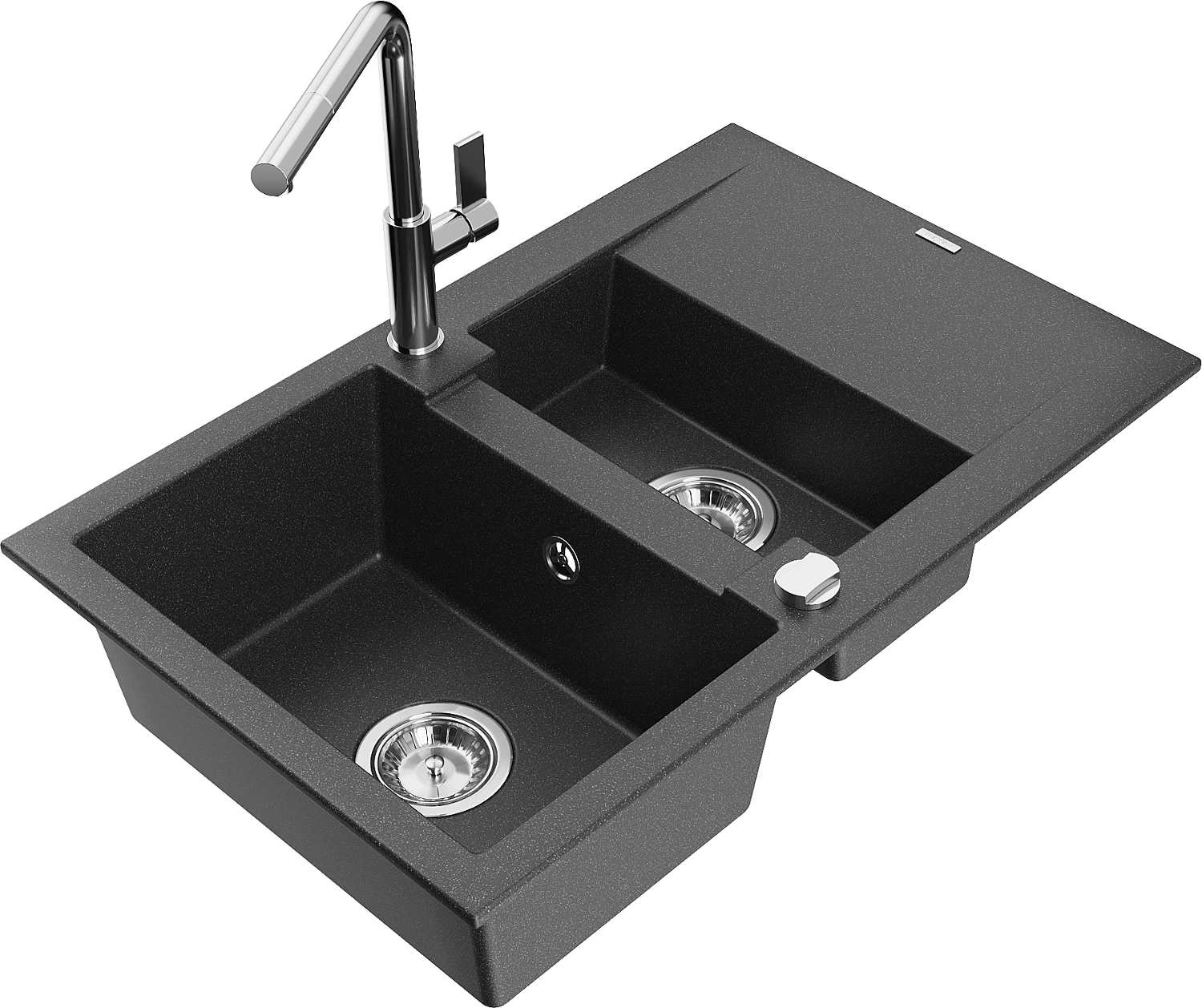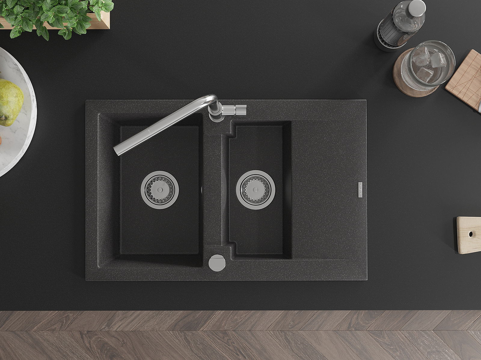 Mexen Gaspar granitinė 1,5 skylių plautuvė su nusausinimo lentyna ir virtuvės maišytuvu Flora, juoda taškuota