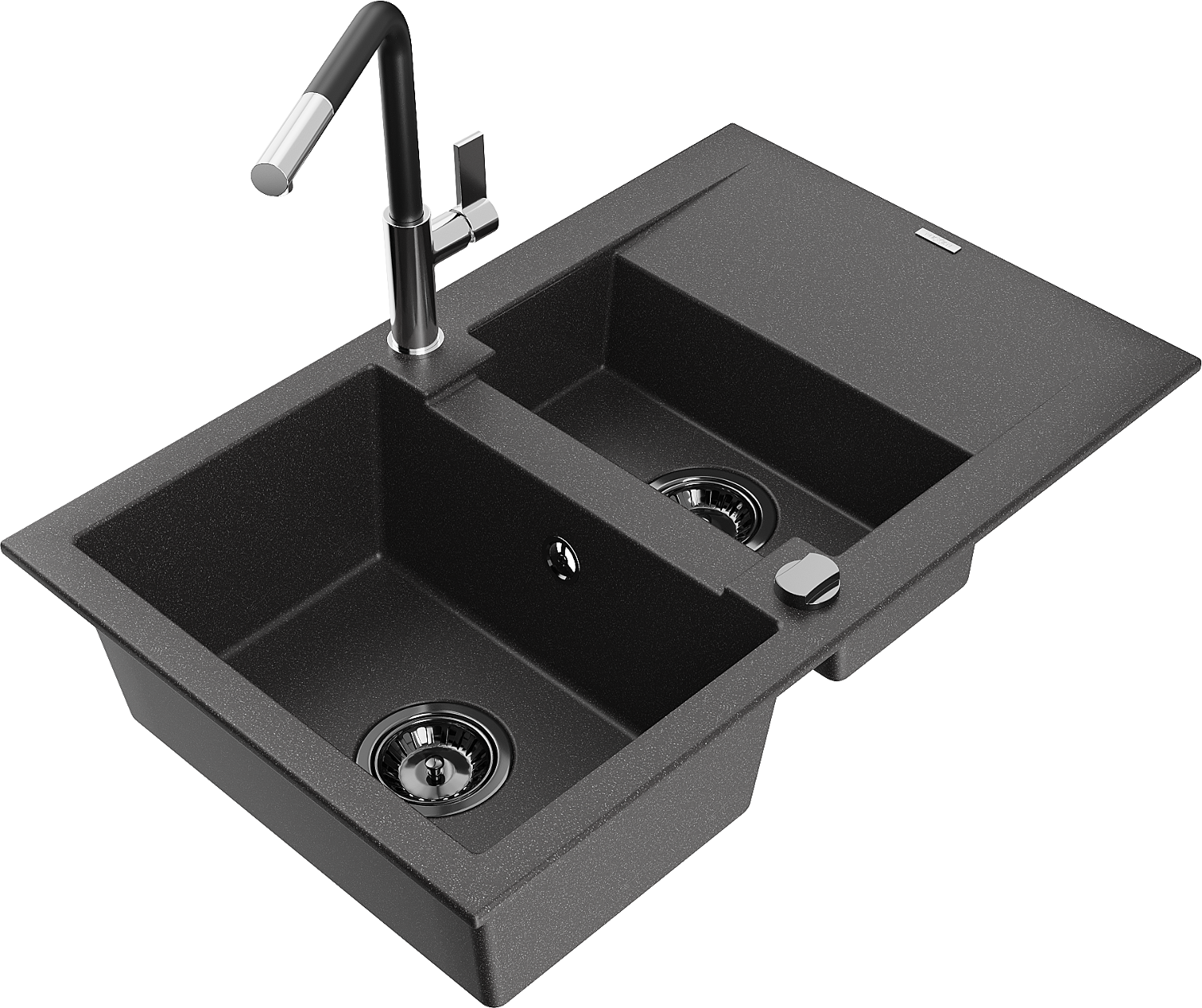 Mexen Gaspar 1,5 dubenų granitinė virtuvės plautuvė su nusausintuvu ir Flora virtuviniu maišytuvu, juoda su taškeliais