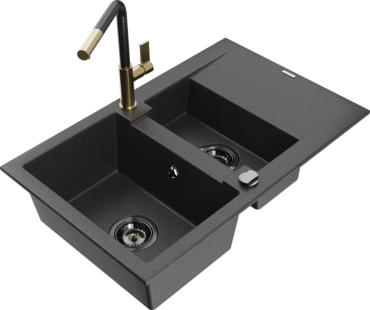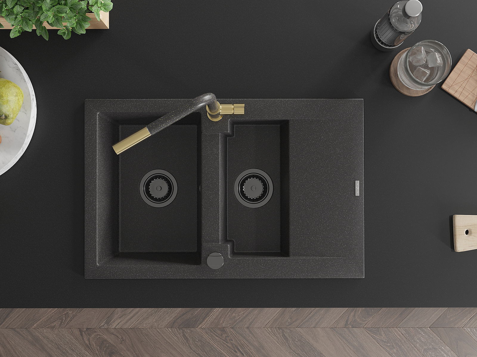 Mexen Gaspar granitinė 1,5 kamerų plautuvė su nusausintuvu ir virtuviniu maišytuvu Flora, juoda taškuota
