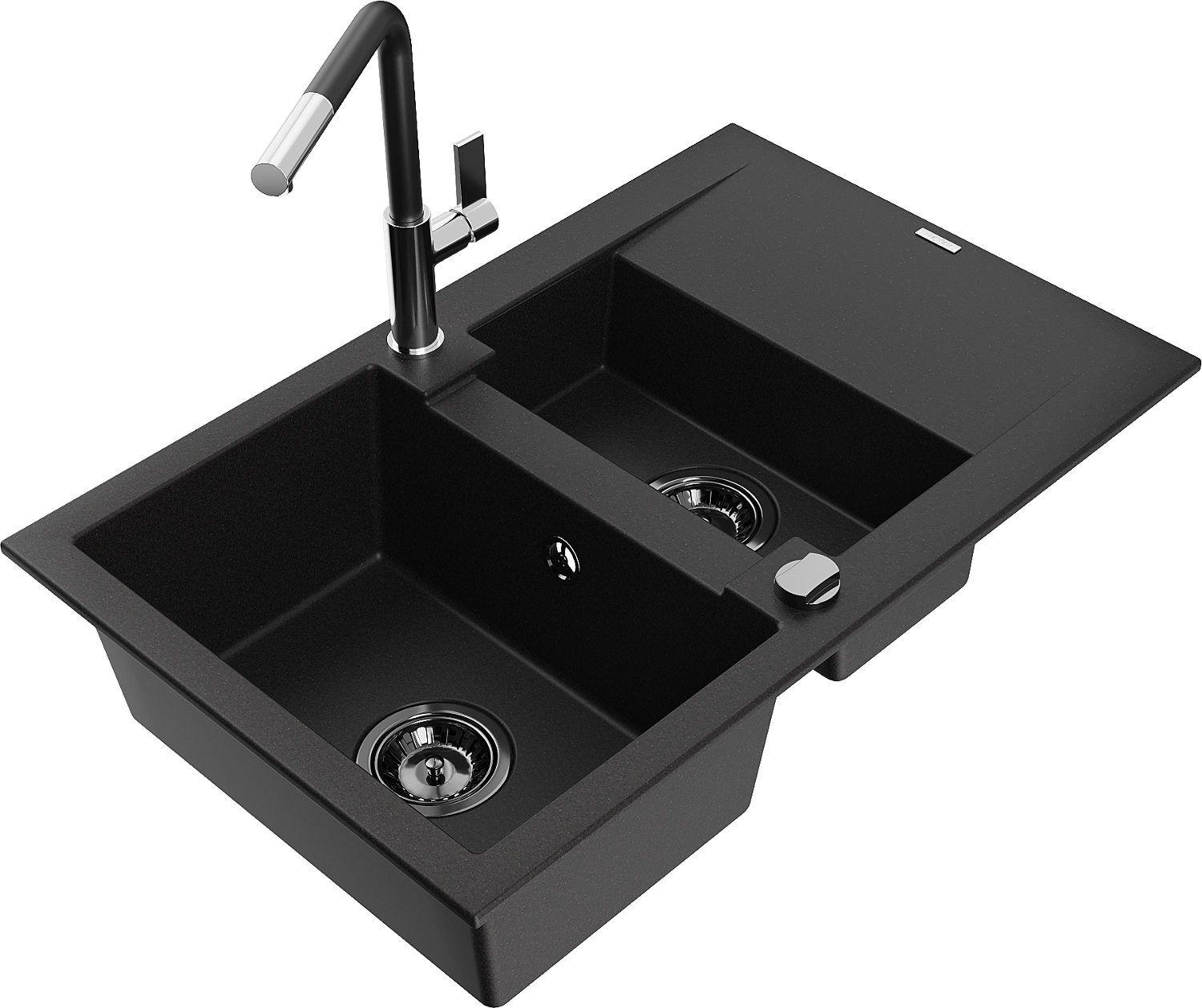 Mexen Gaspar granito plautuvė 1,5 kamerų su indų džiovykle ir virtuvės maišytuvu Flora, juoda - 6507-77-670401-07-B