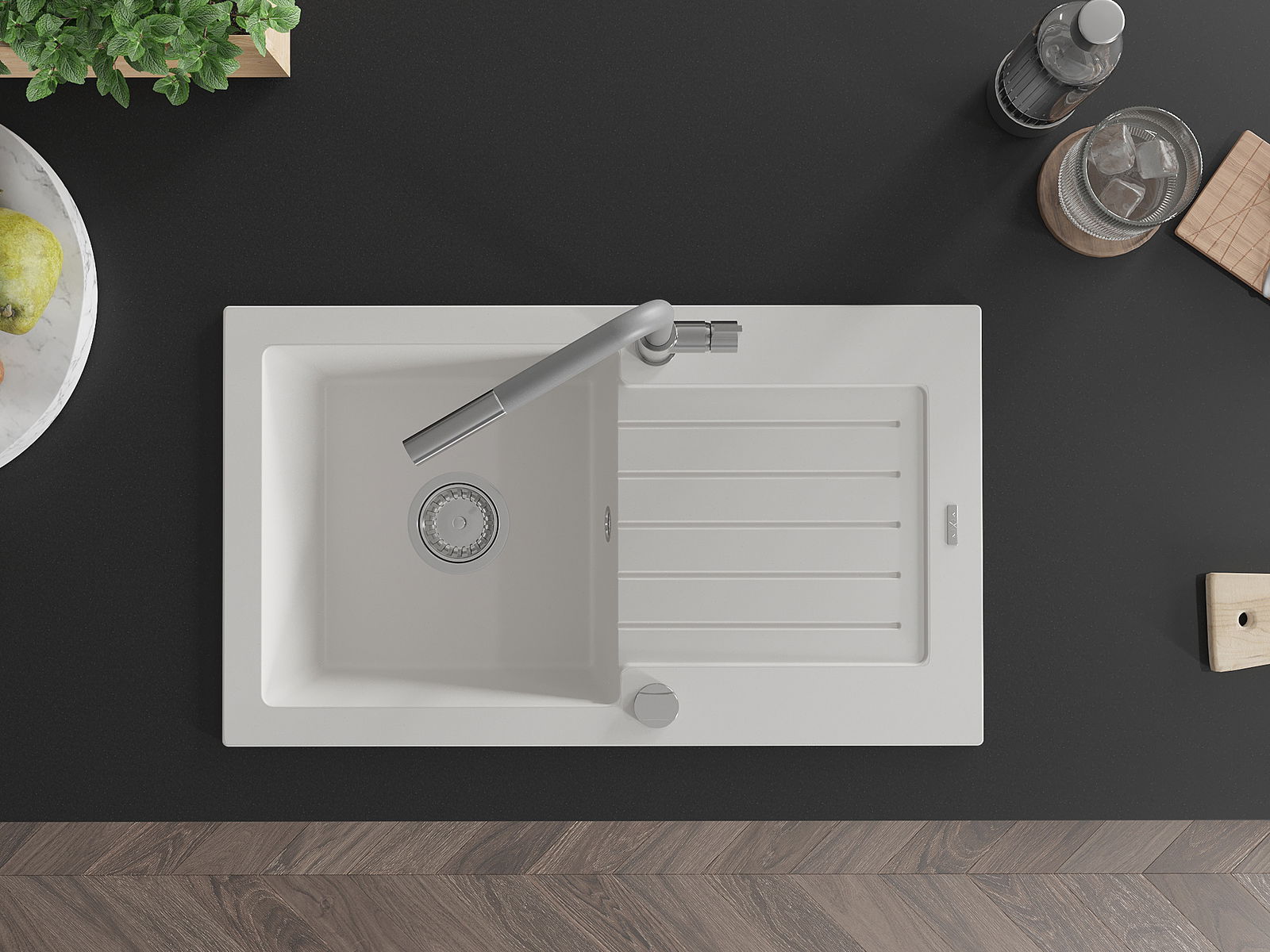 Mexen Pablo granitinis plautuvė su viena kamera ir nusausintuvu bei Flora virtuvės maišytuvu, baltas - 6510-20-670401-06