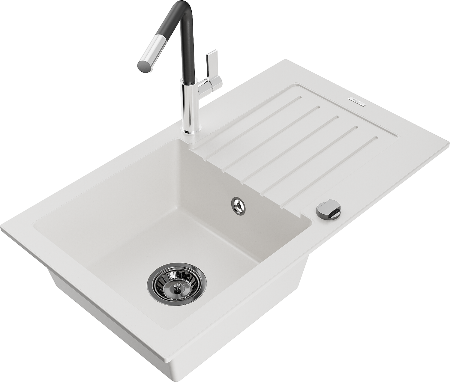 Mexen Pablo granito plautuvė su 1 kamera, nutekėjimo ir virtuviniu maišytuvu Flora, balta - 6510-20-670401-07-B
