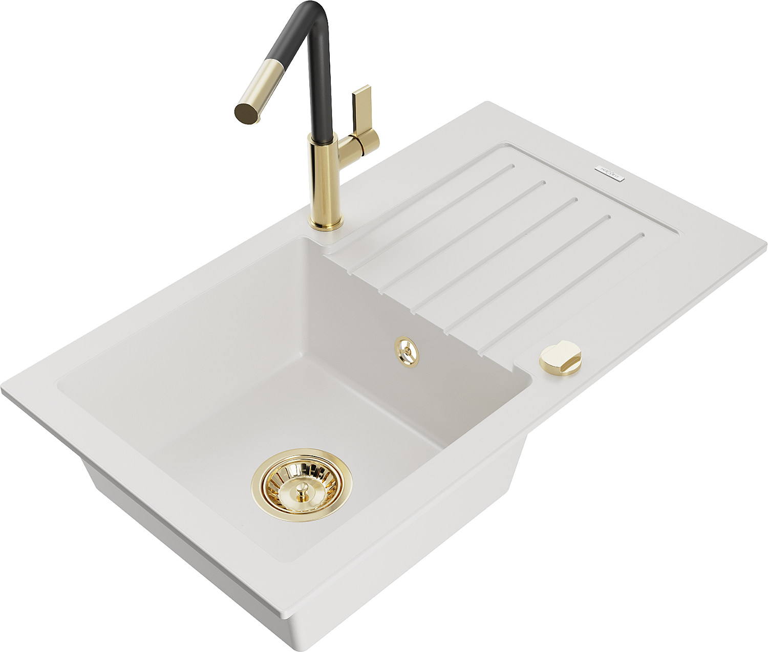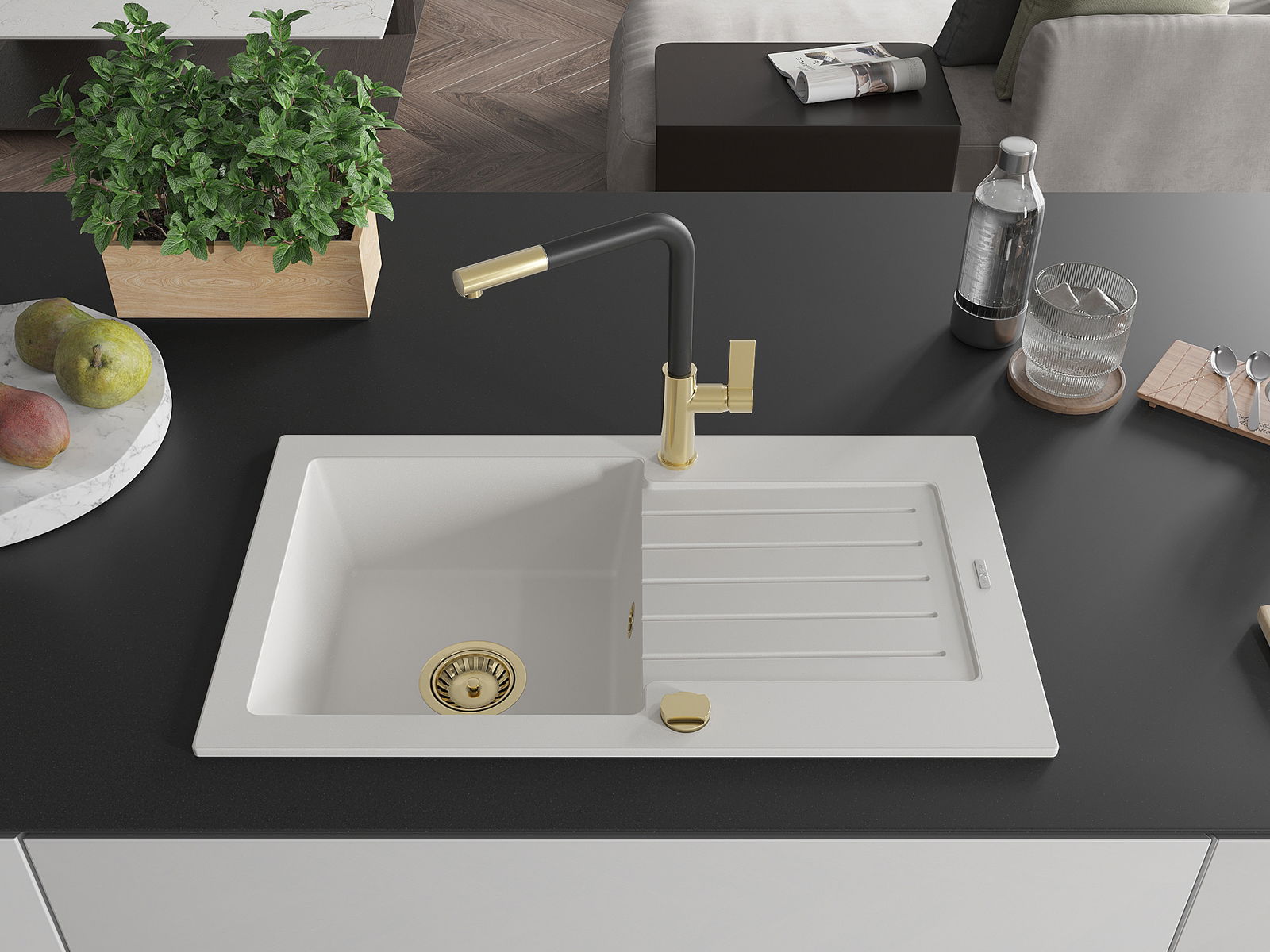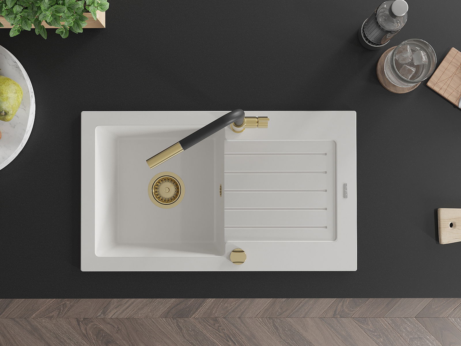 Mexen Pablo vienos kameros granitinė plautuvė su nutekamąja dalimi ir Flora virtuviniu maišytuvu, balta - 6510-20-670401-57-G