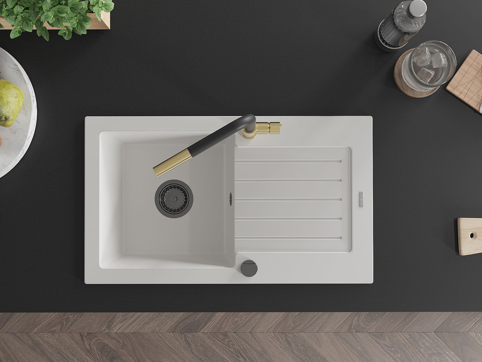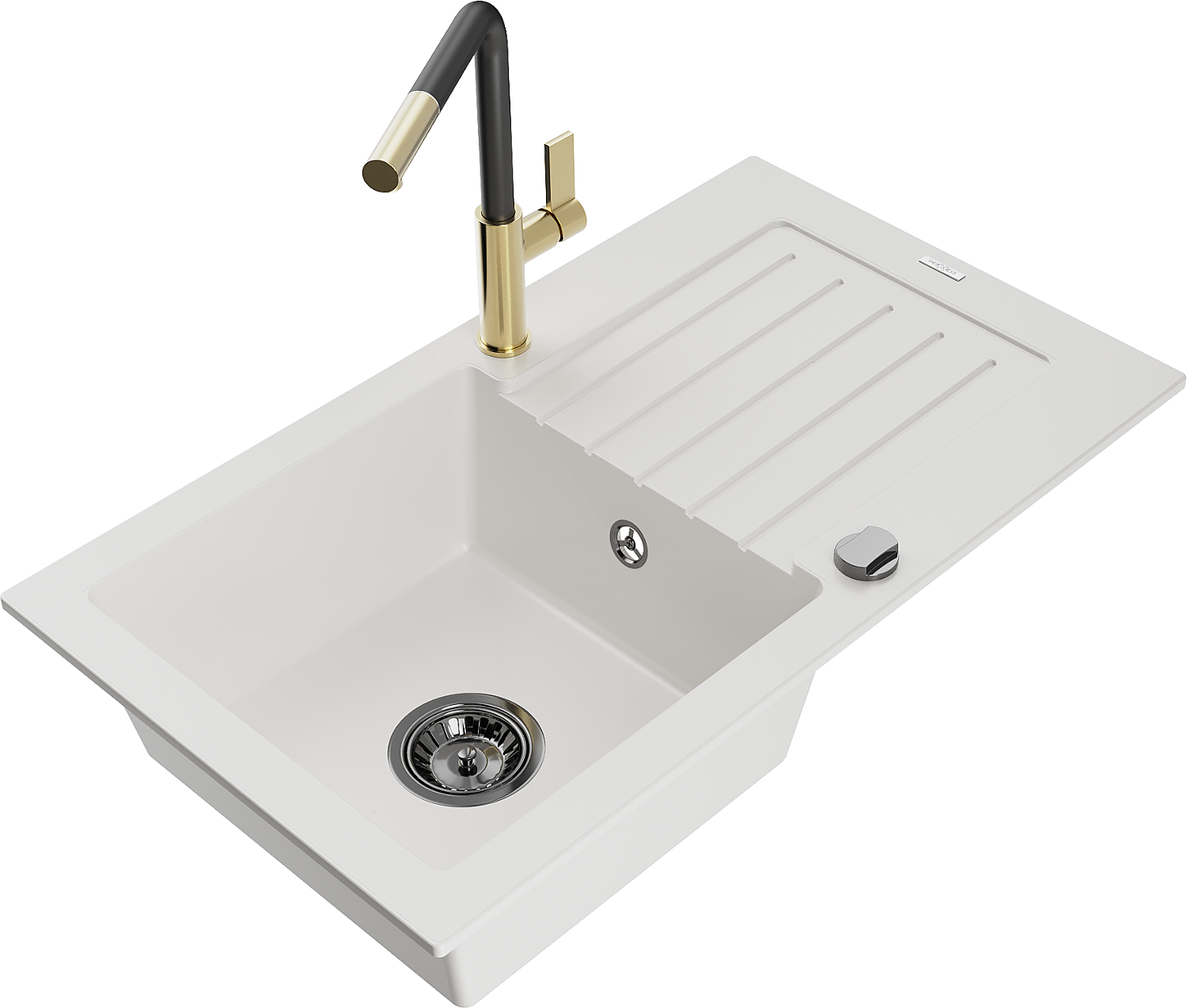 Mexen Pablo granitinis vienos kameros plautuvas su nusausintoju ir virtuviniu maišytuvu Flora, baltas - 6510-20-670401-57-B