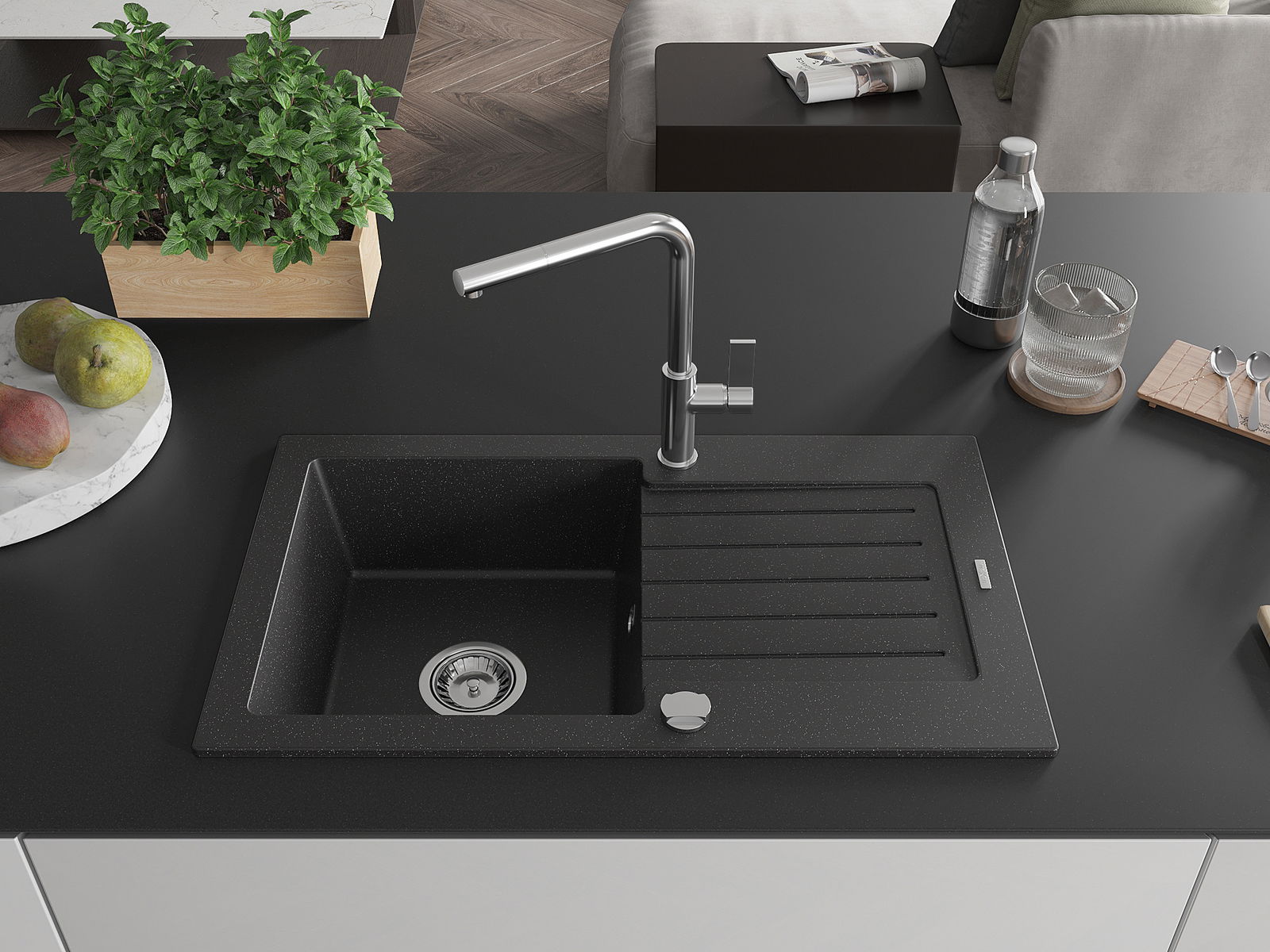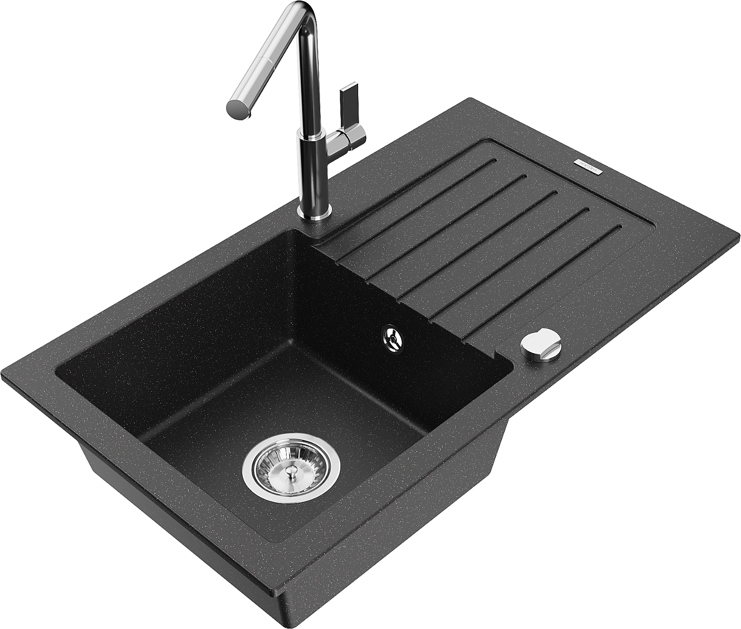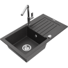 Mexen Pablo 1 dubens granito kriauklė su lentyna ir Flora virtuviniu maišytuvu, juoda/sidabro metalo - 6510-73-670401-00