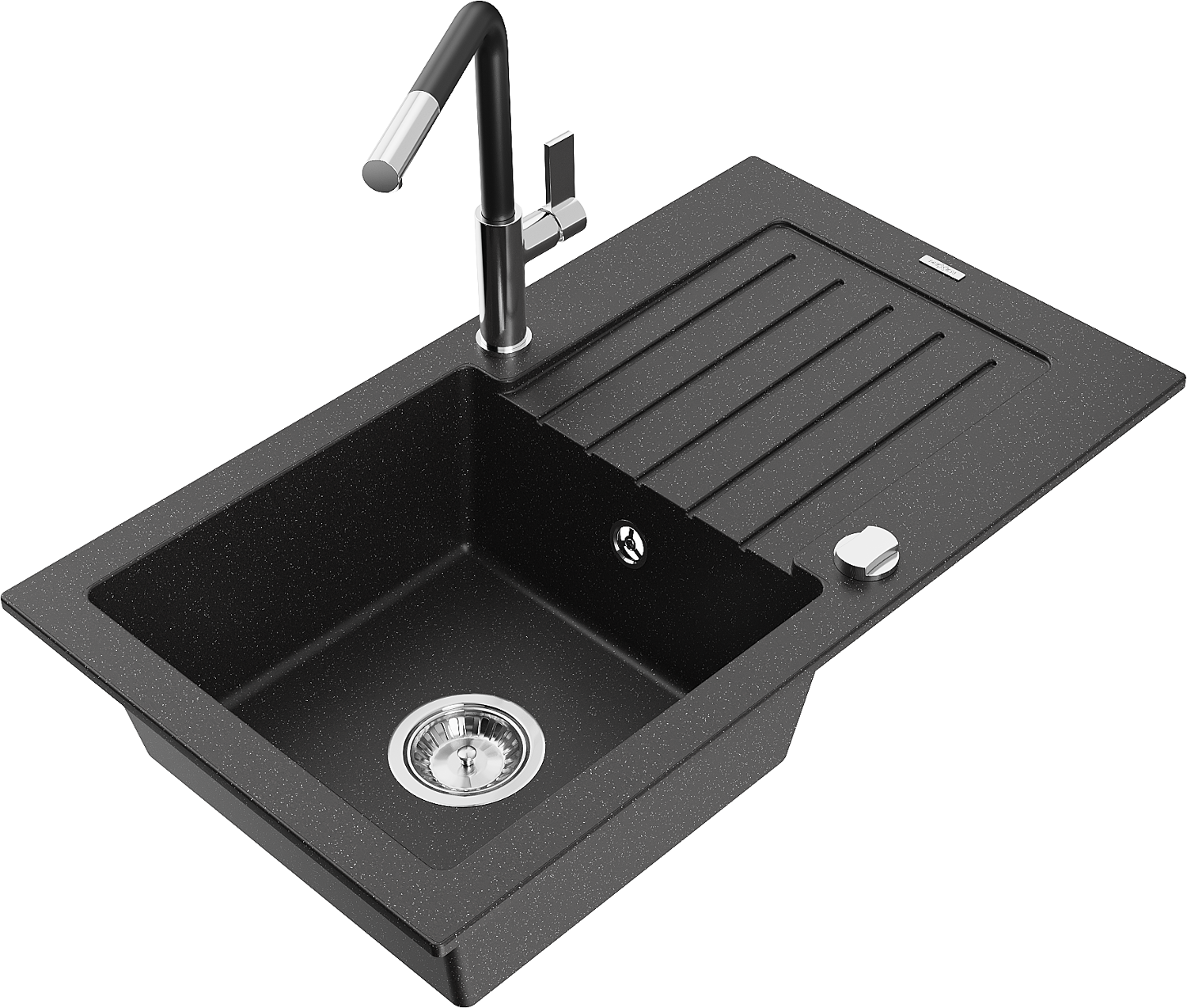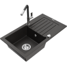 Mexen Pablo granitinis vienos kameros kriauklė su drenažu ir virtuviniu maišytuvu Flora, juoda/sidabrinis metalikas