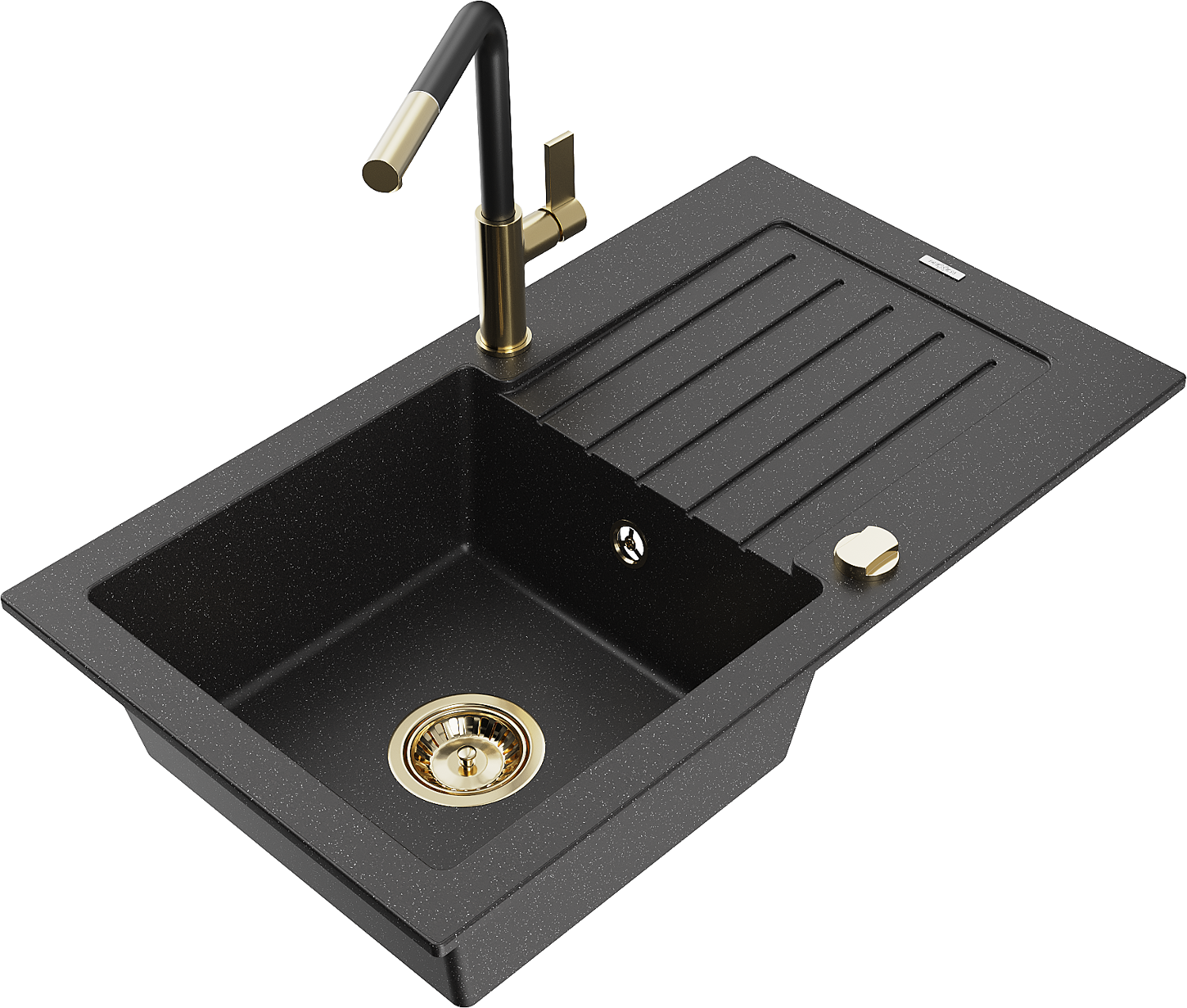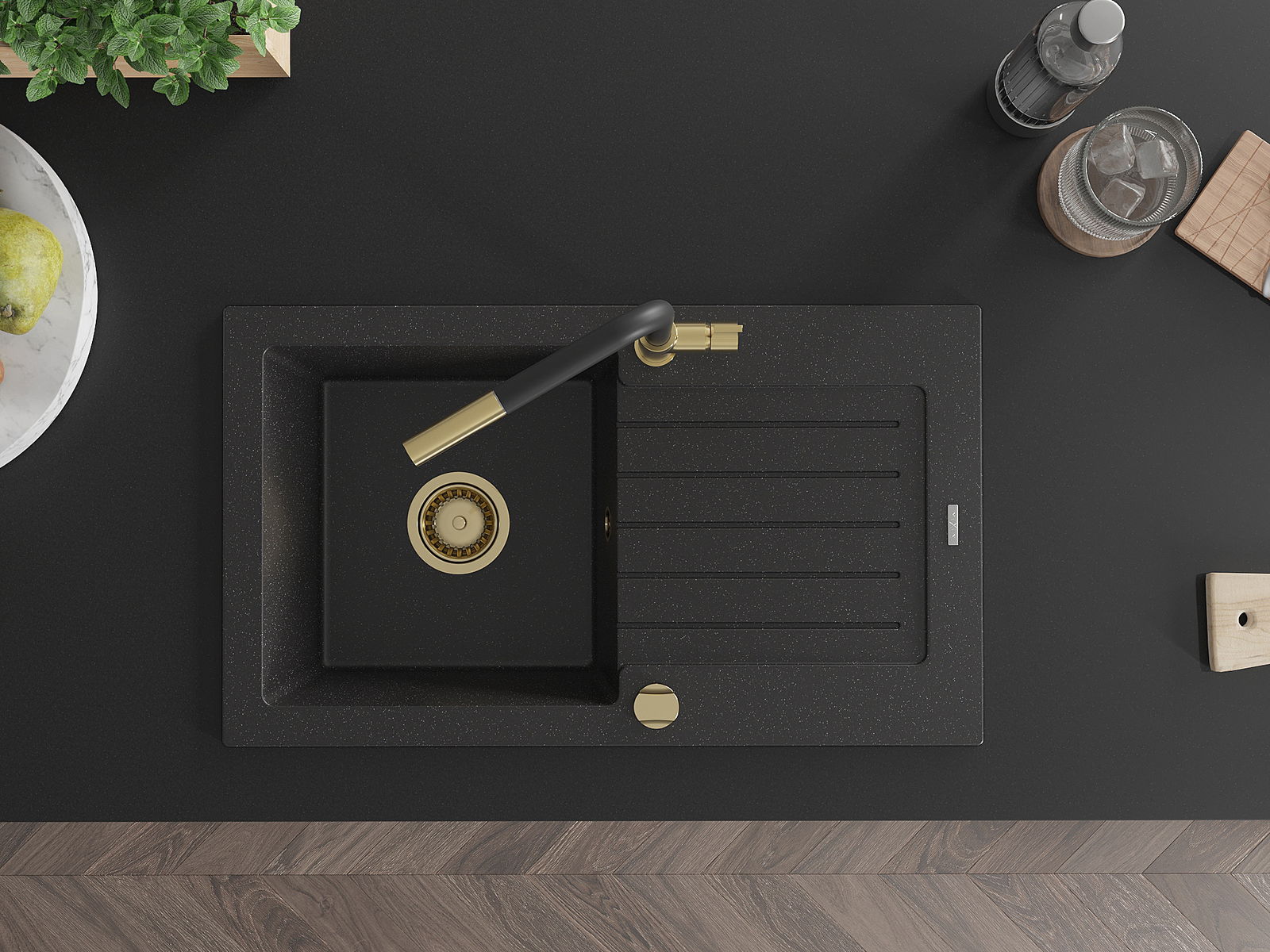 Mexen Pablo vientisas granito kriauklė su drenažu ir Flora virtuvės maišytuvu, juoda/sidabro metalikas - 6510-73-670401-57-G