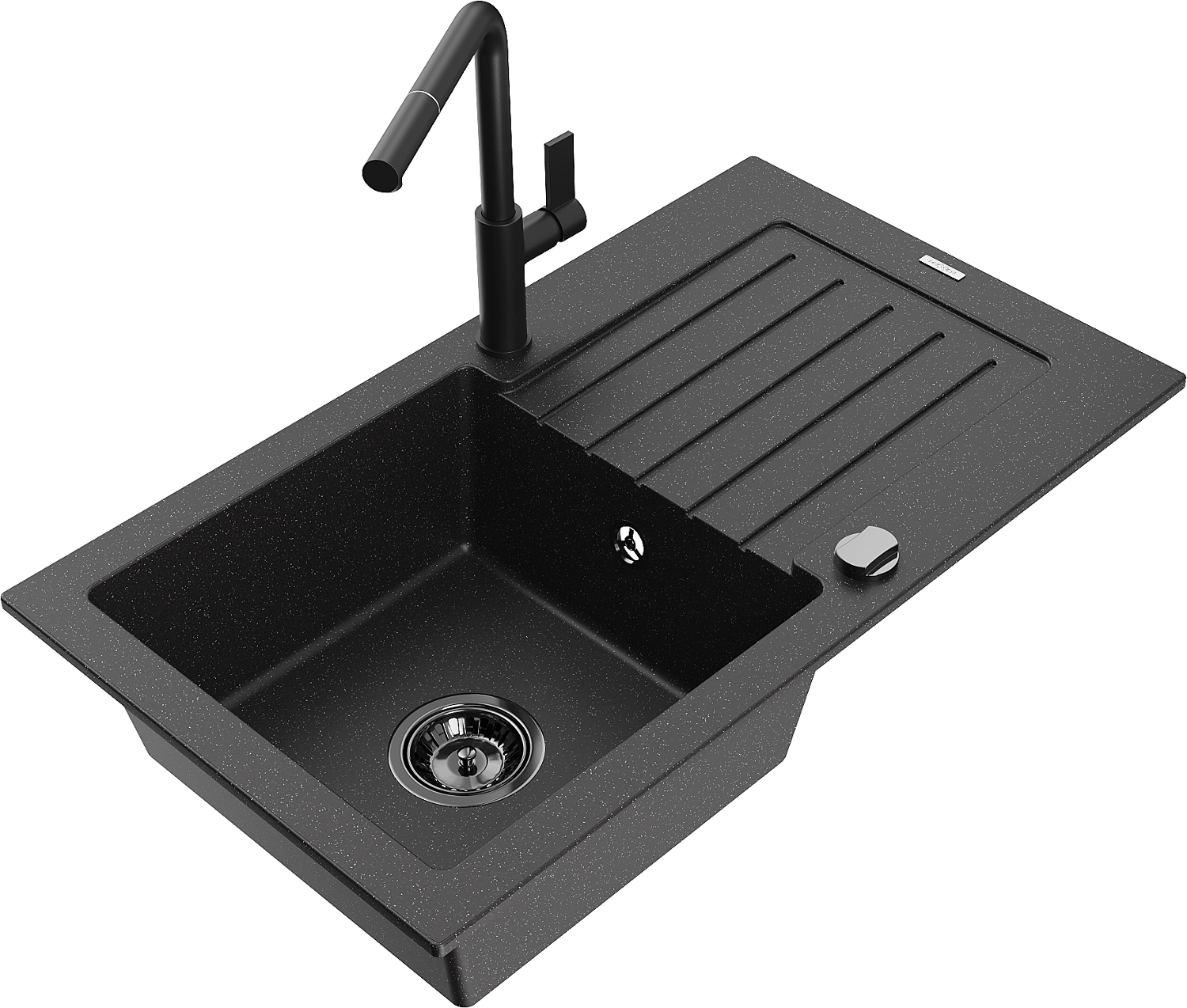 Mexen Pablo 1 skyriumių granitinė plautuvė su nutekėjimu ir virtuvės maišytuvu Flora, juoda/sidabro metalo spalvos