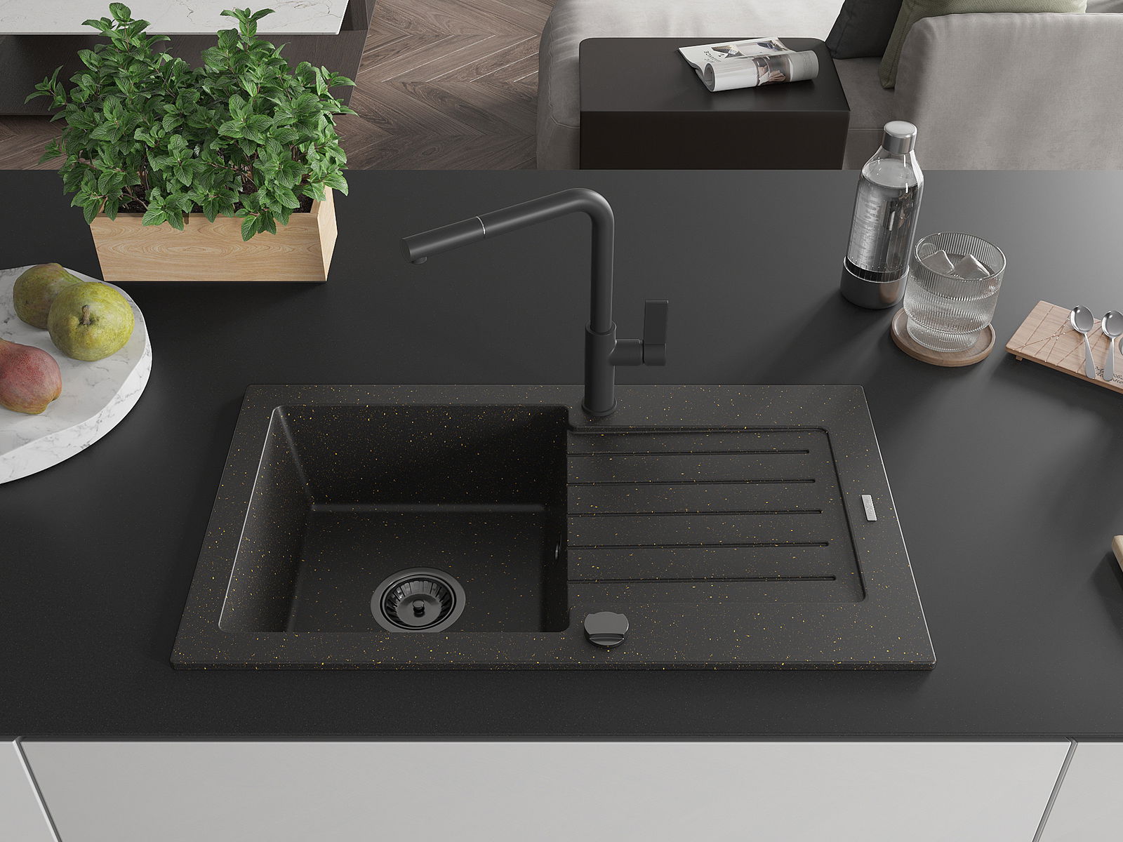 Mexen Pablo granitinė vienos plautuvės kriauklė su nusausinimo padėklu ir Flora virtuviniu maišytuvu, juoda/aukso metalo