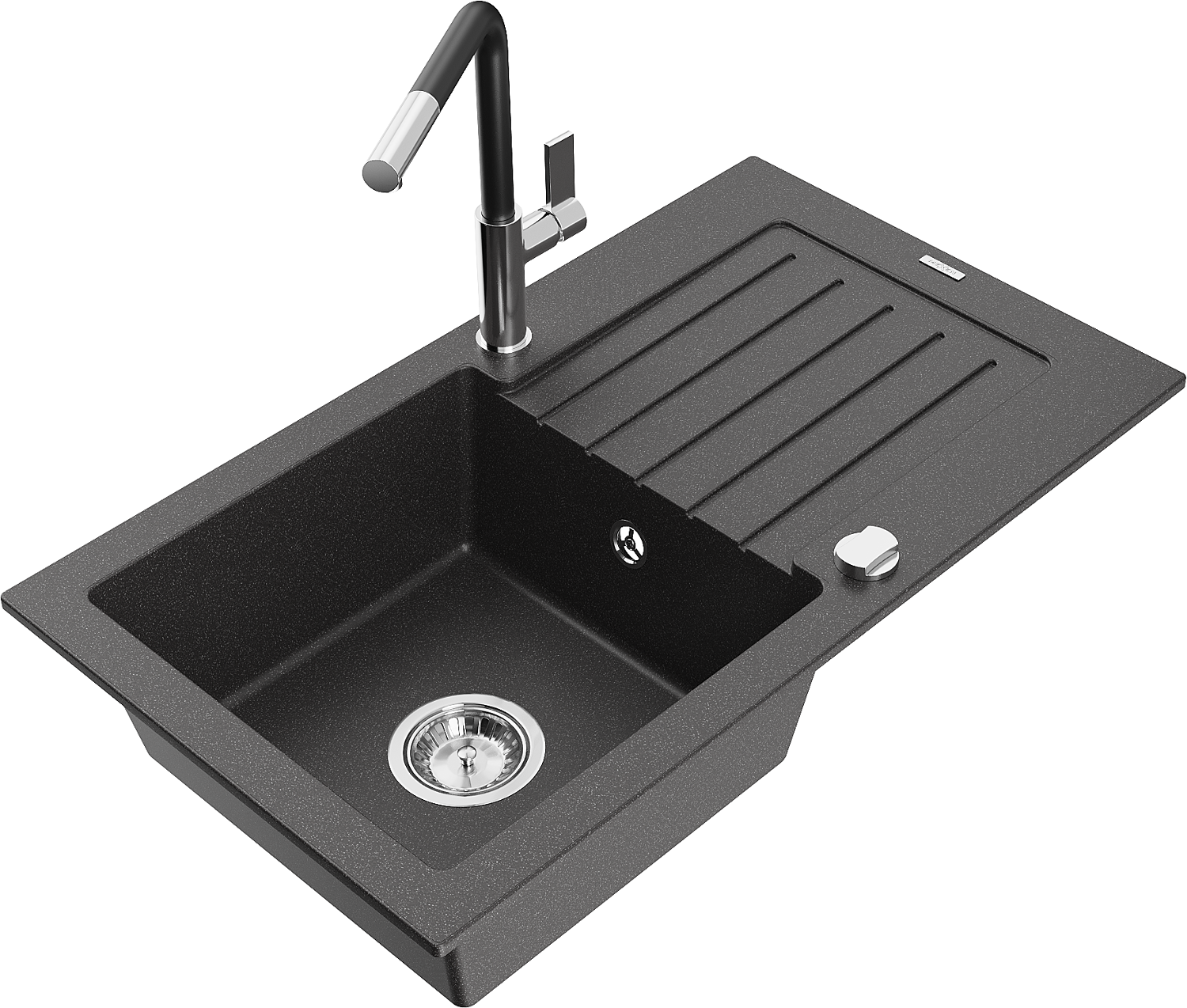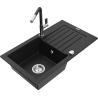 Mexen Pablo granitinė vienos kameros kriauklė su nutekėjimu ir virtuviniu maišytuvu Flora, juoda su taškais