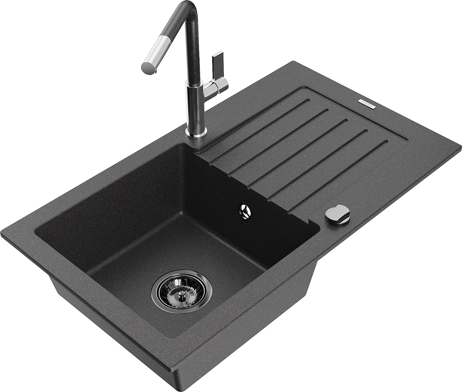 Mexen Pablo granito kriauklė 1 kamerinė su drenažu ir Flora virtuviniu maišytuvu, juodai dėmėtas - 6510-76-670401-08-B