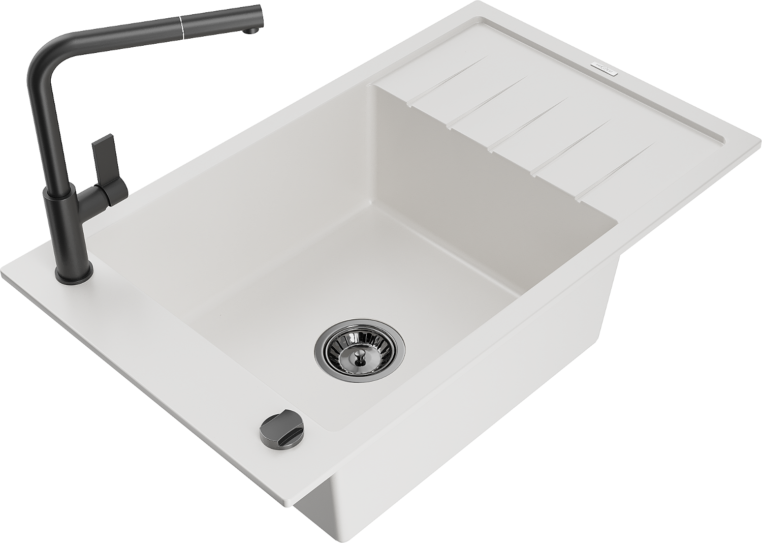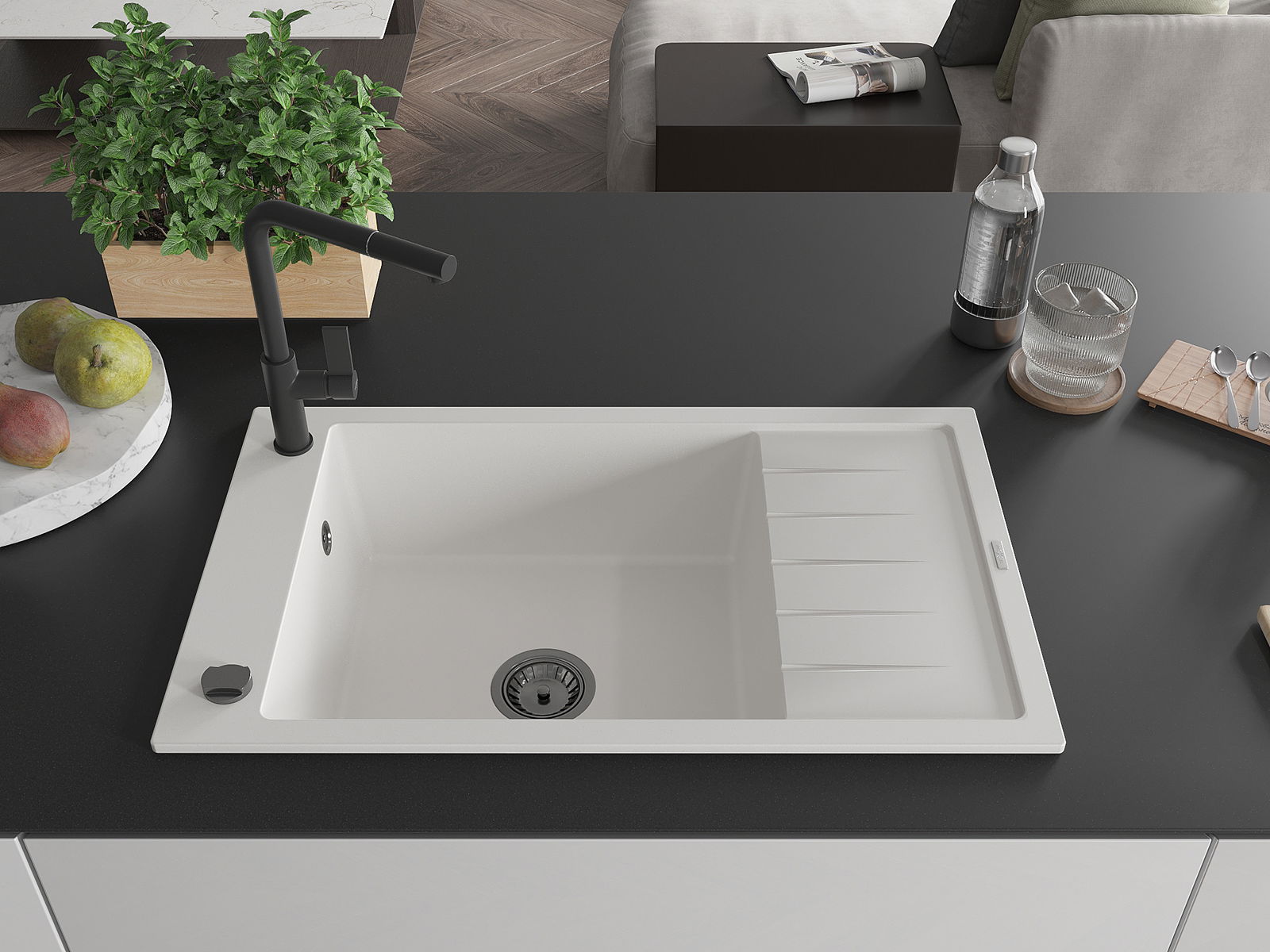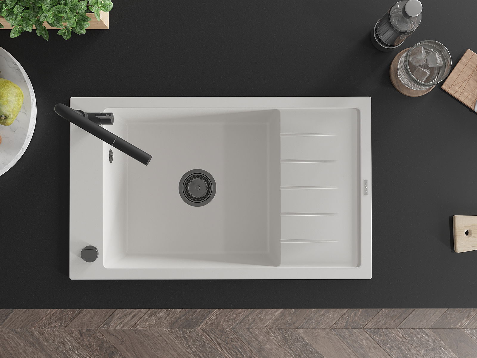 Mexen Elias granito plautuvė su viena kamera ir nusausinimo indu bei virtuviniu maišytuvu Flora, balta - 6511-20-670401-70-B