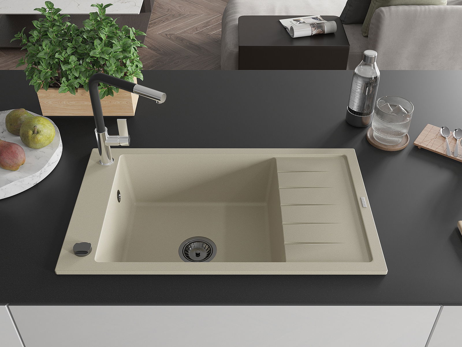 Mexen Elias vienos dalies granitinė kriauklė su indaplove ir virtuviniu maišytuvu Flora, smėlio - 6511-69-670401-07-B