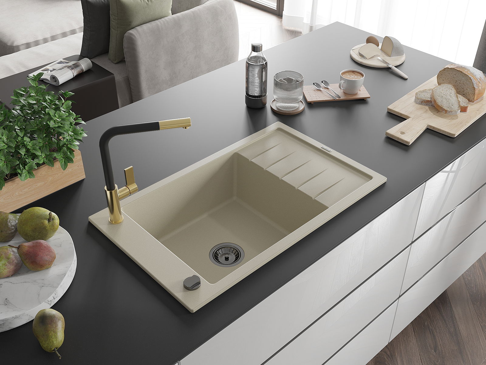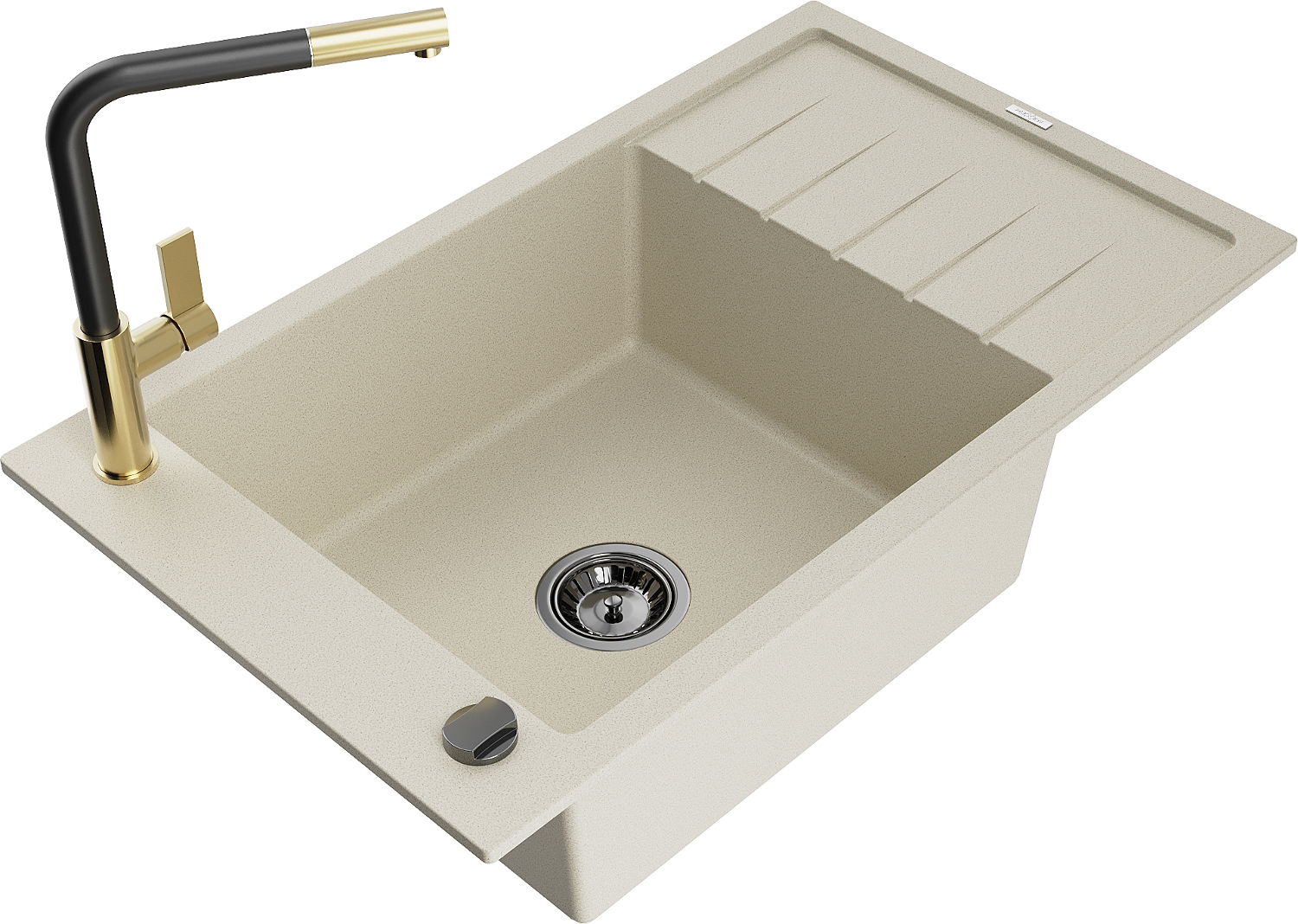 Mexen Elias granito virtuvės kriauklė su vienu dubeniu ir nutekamu, su Flora virtuviniu maišytuvu, smėlio - 6511-69-670401-57-B