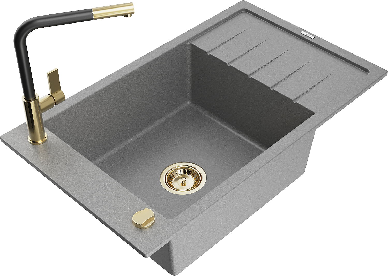 Mexen Elias granitinė vienos kameros plautuvė su nutekėjimo ir Flora virtuviniu maišytuvu, pilka - 6511-71-670401-57-G