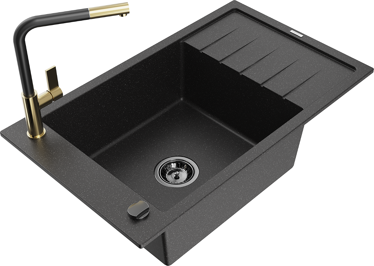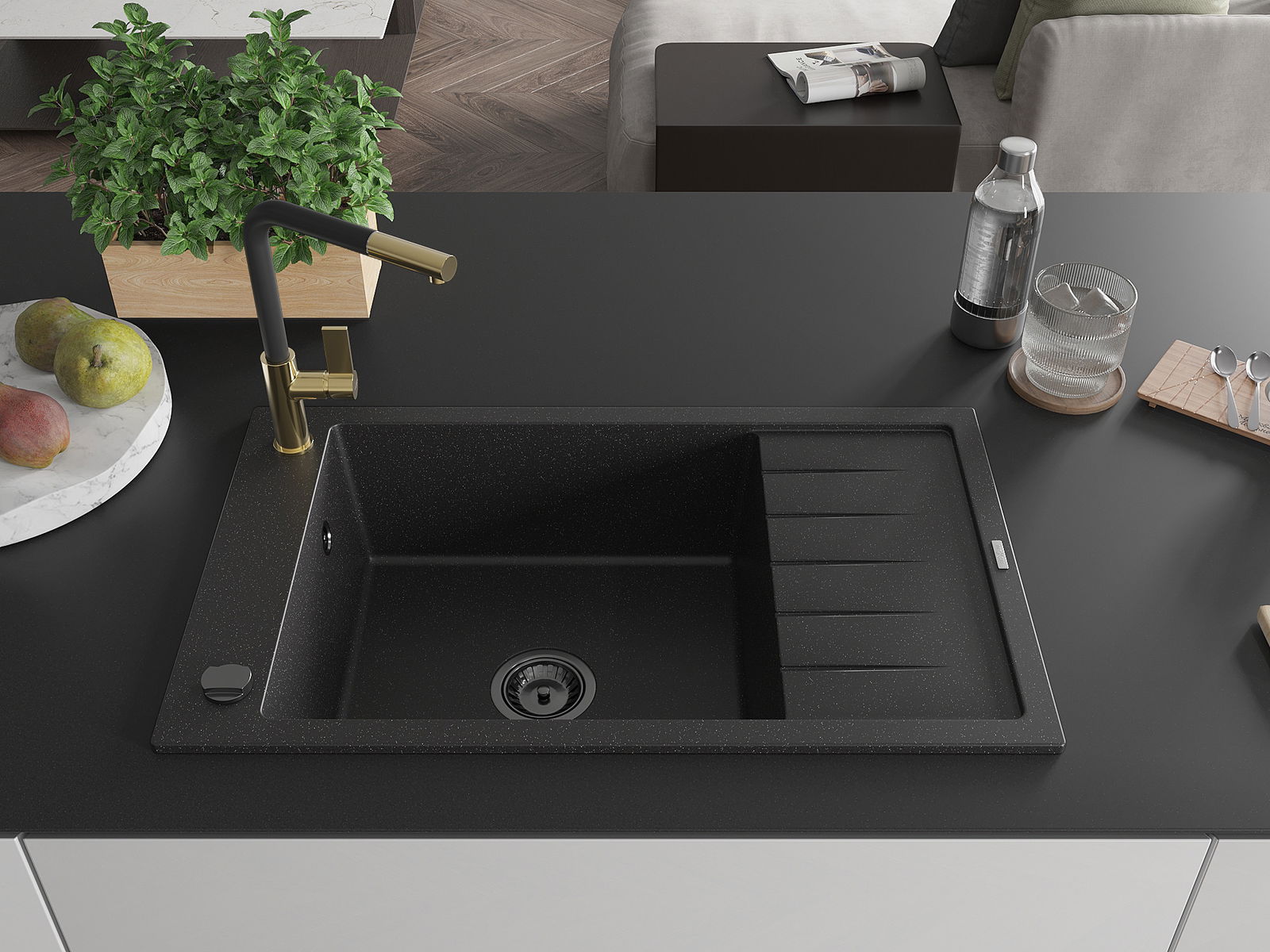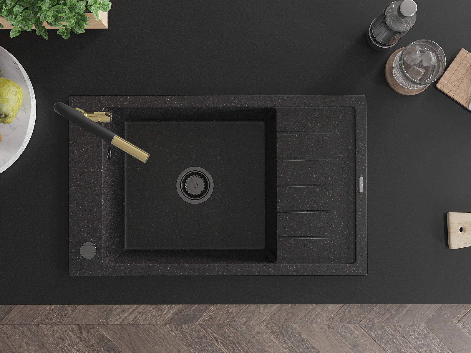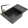 Mexen Elias granitinė 1 kameros kriauklė su nusodintuvu ir virtuviniu maišytuvu Flora, juoda/sidabrinė metalikas