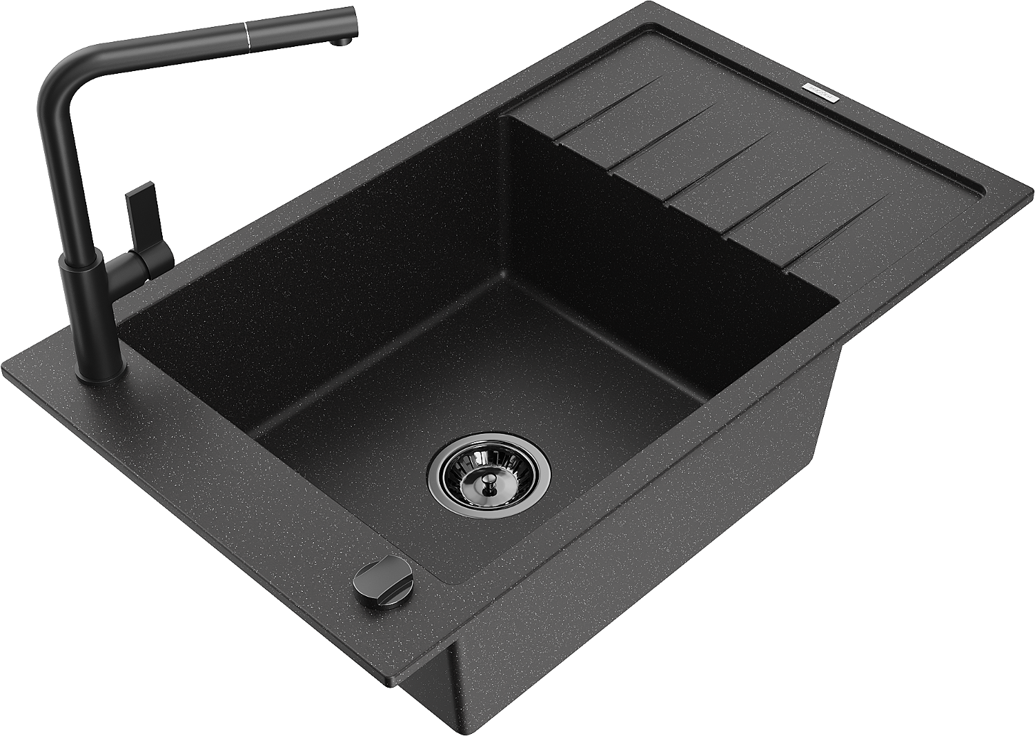 Mexen Elias granitinis vienos kameros plautuvė su nuvarvėjimo vieta ir virtuvės maišytuvu Flora, juodas/sidabrinis metalikas - ?