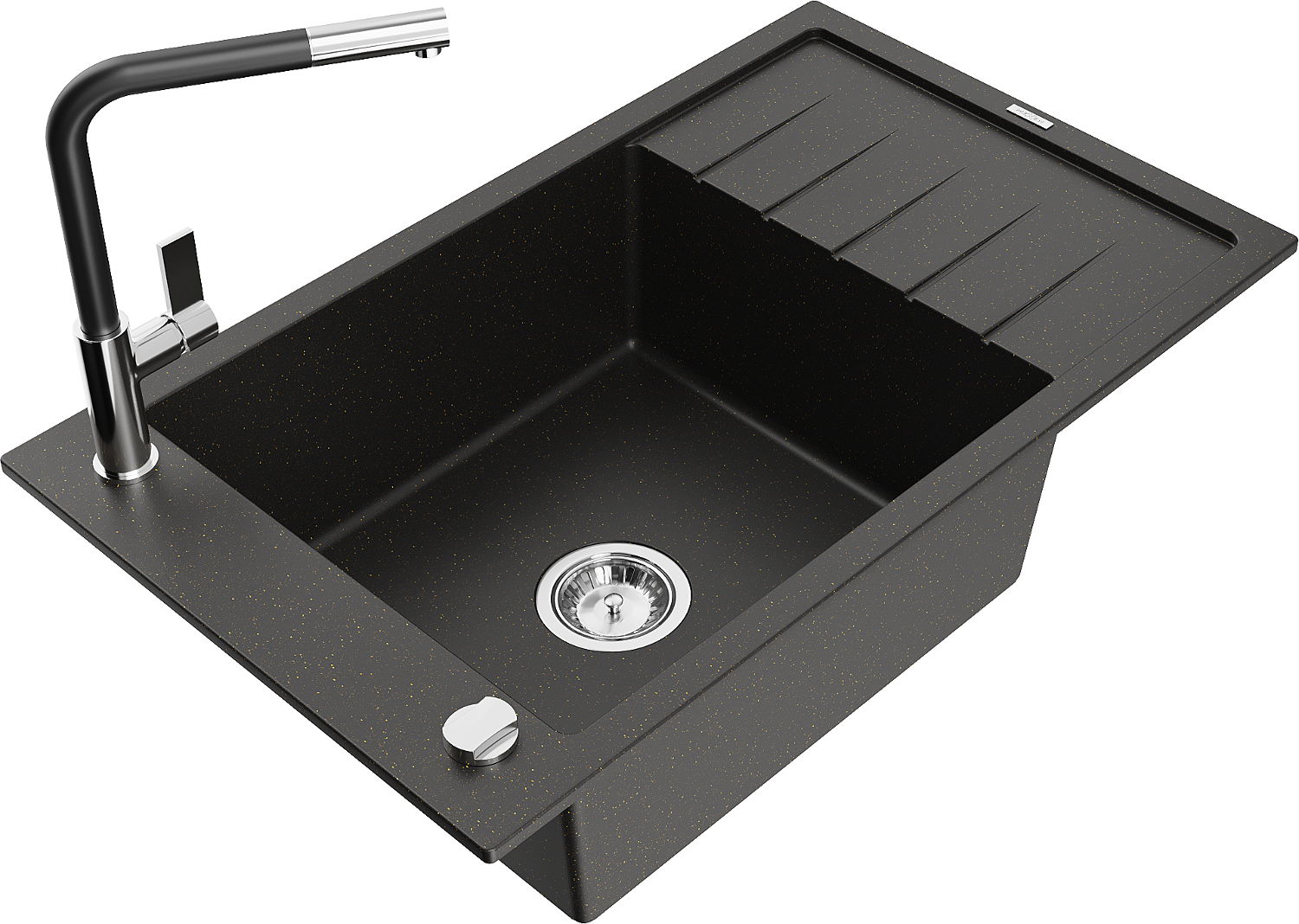Mexen Elias vienos plautuvės granito kriauklė su lašintuvu ir Flora virtuviniu maišytuvu, juoda/auksinė metalo spalva