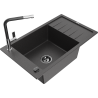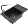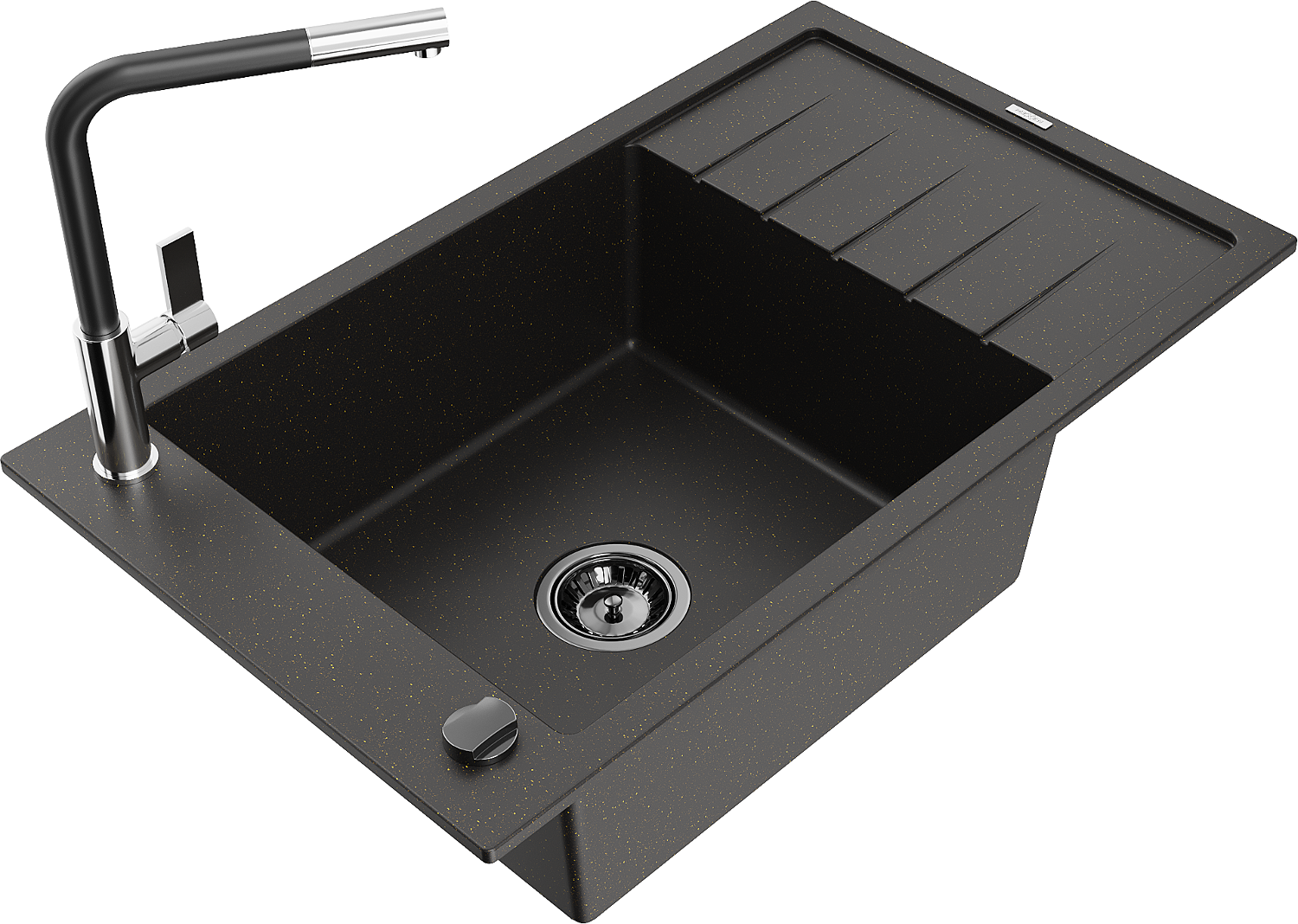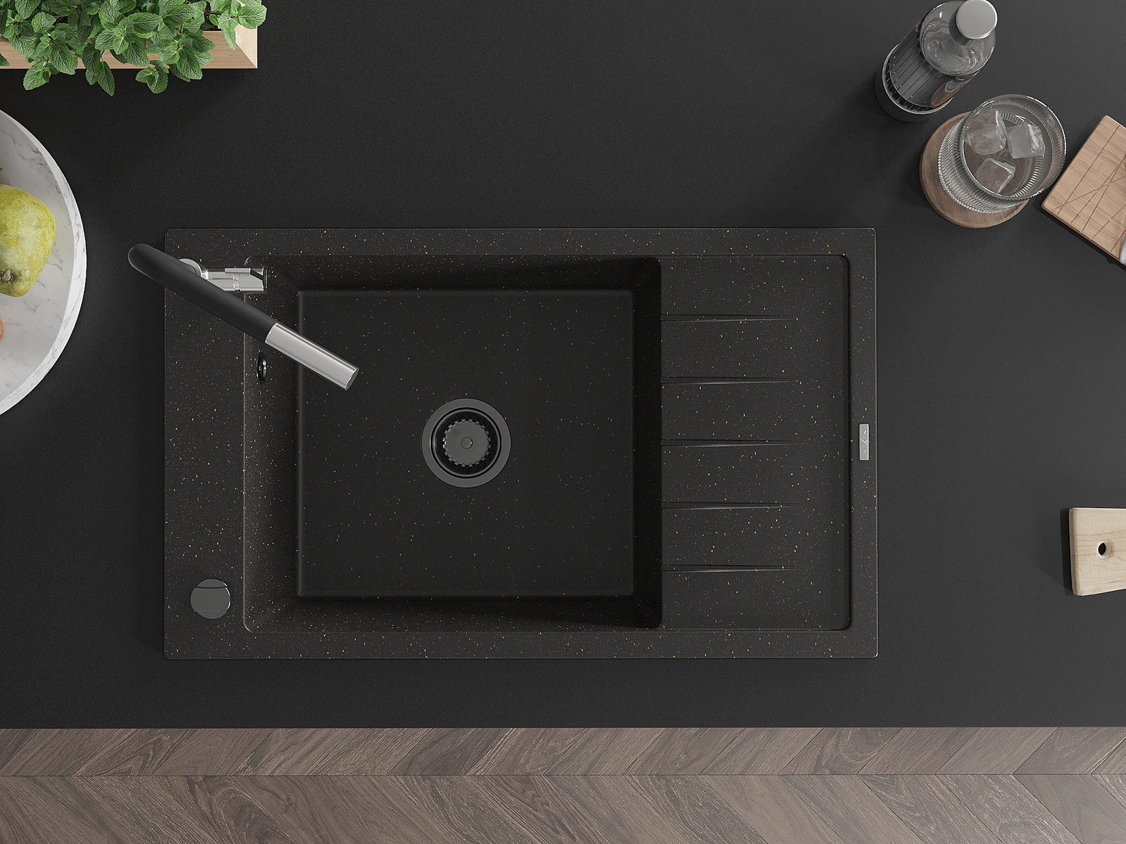 Mexen Elias granitinė 1 kamerų plautuvė su nusausinimo lentyna ir virtuviniu maišytuvu Flora, juoda/aukso metallic