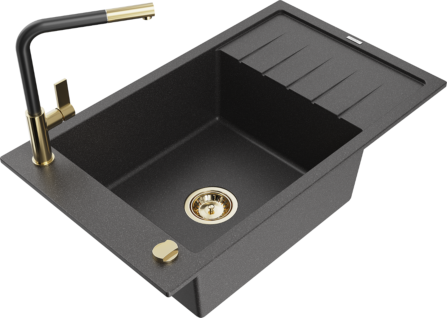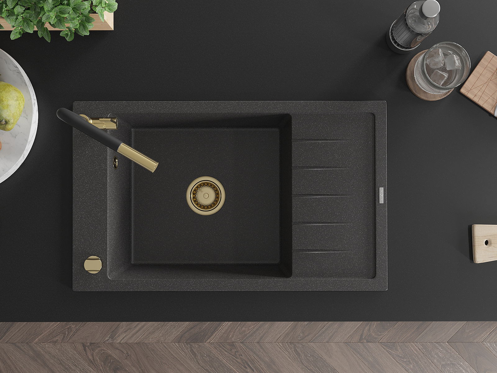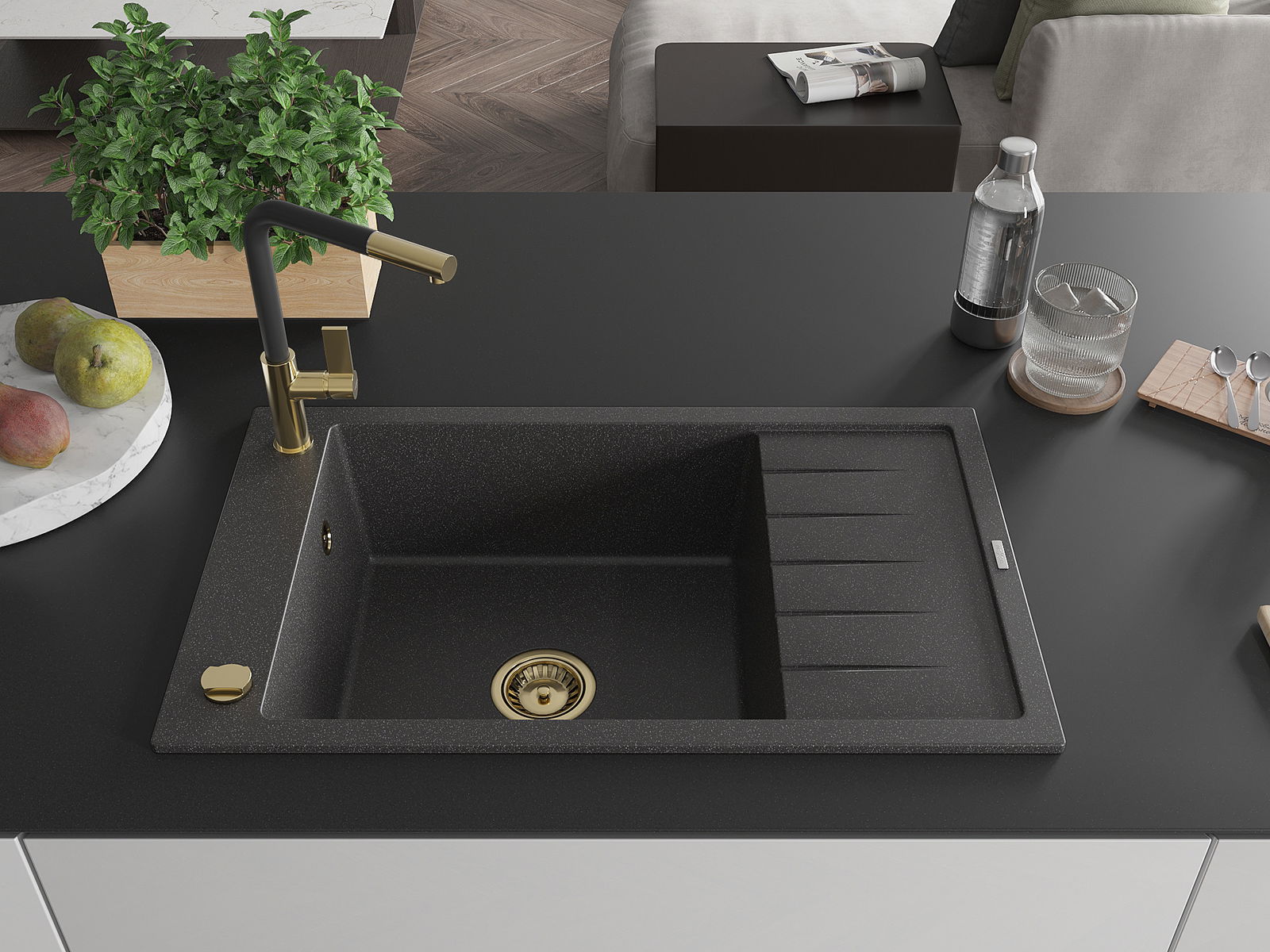 Mexen Elias granito plautuvė su 1 skyriumi, su drenažu ir virtuvės maišytuvu Flora, juoda su taškeliais - 6511-76-670401-57-G