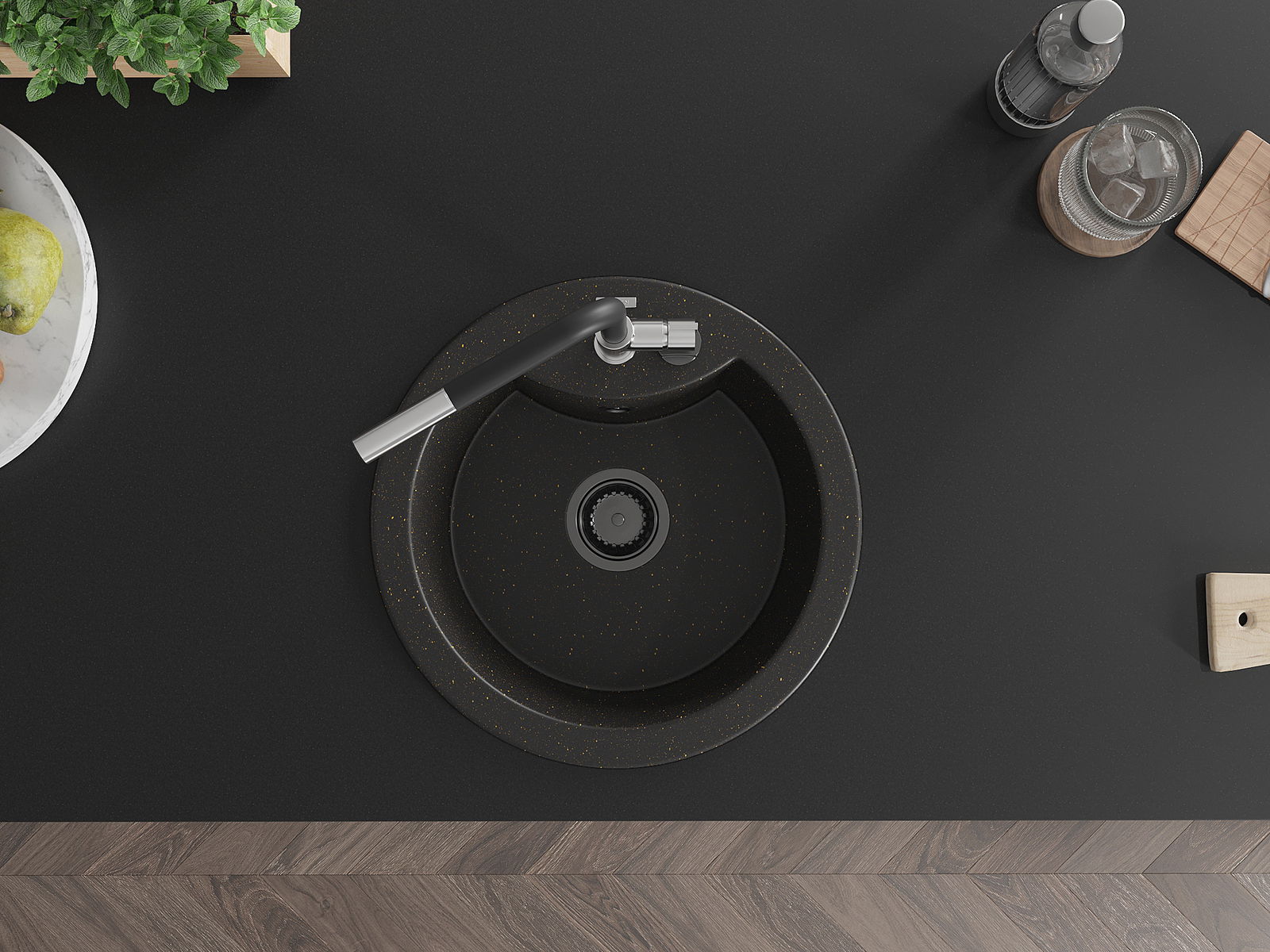 Mexen Diego granitinis vienos kameros virtuvinis plautuvas su Flora virtuvine maišytuve, juoda/aukso metaliko - 6512-75-670401-?
