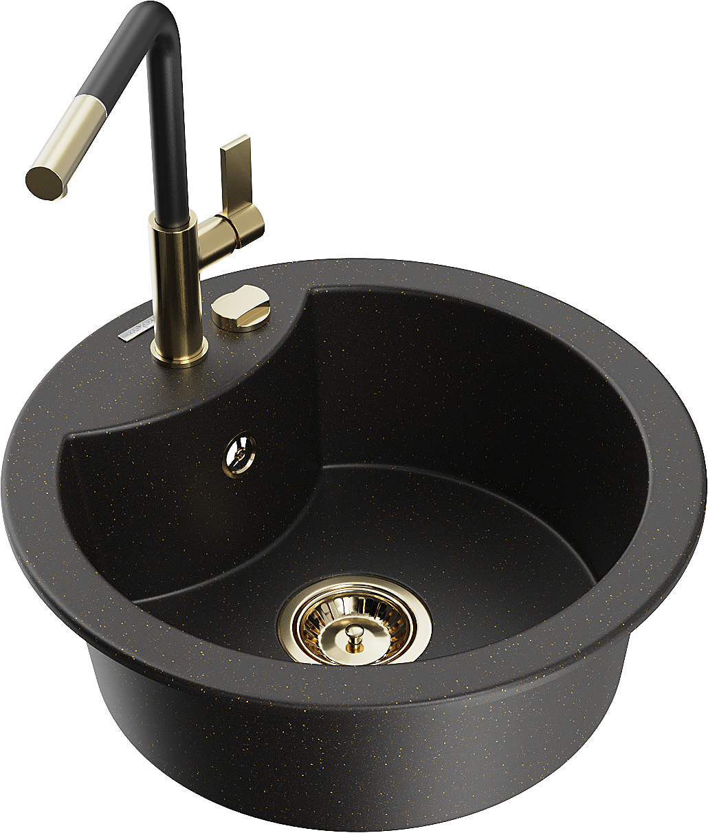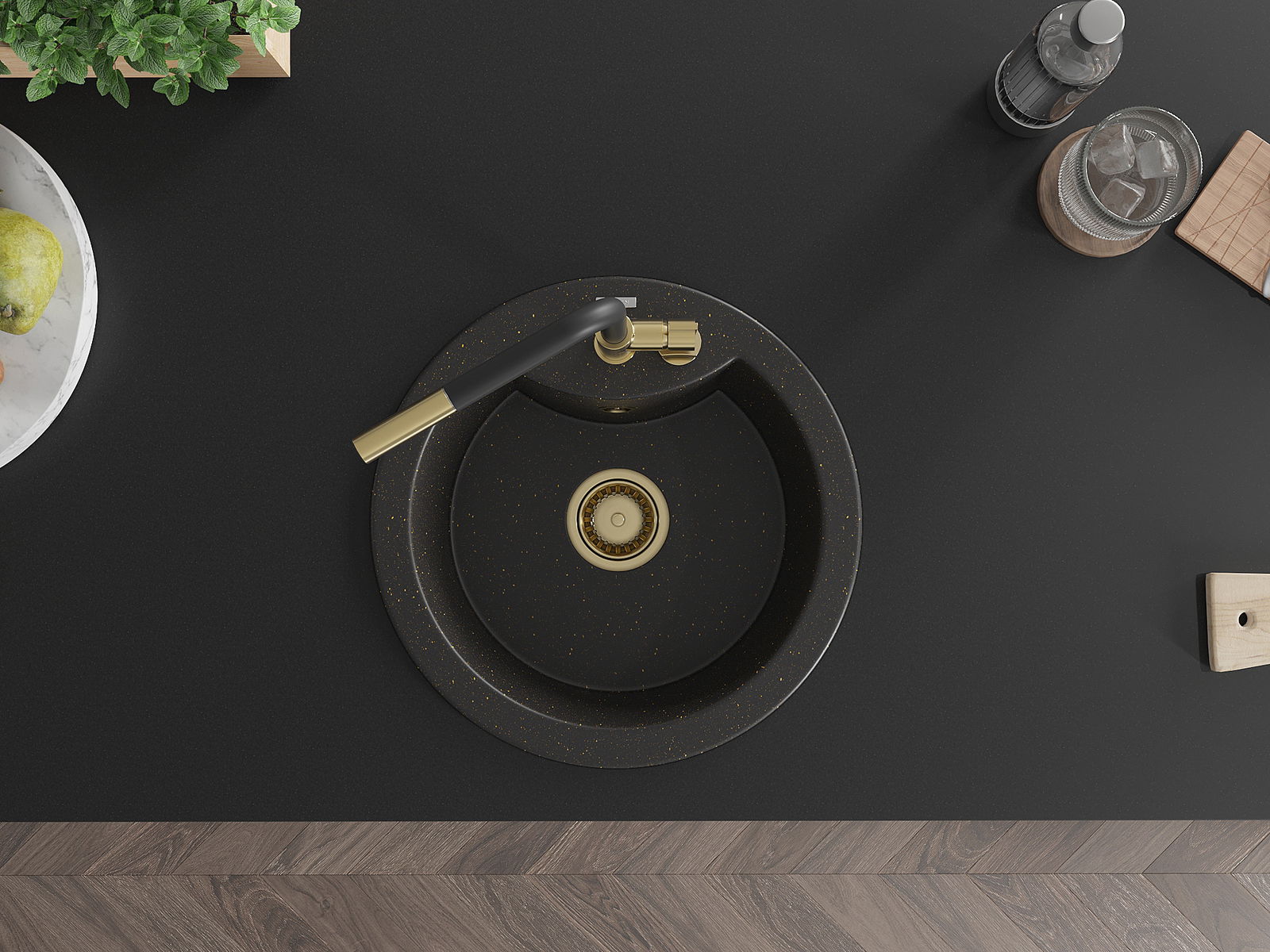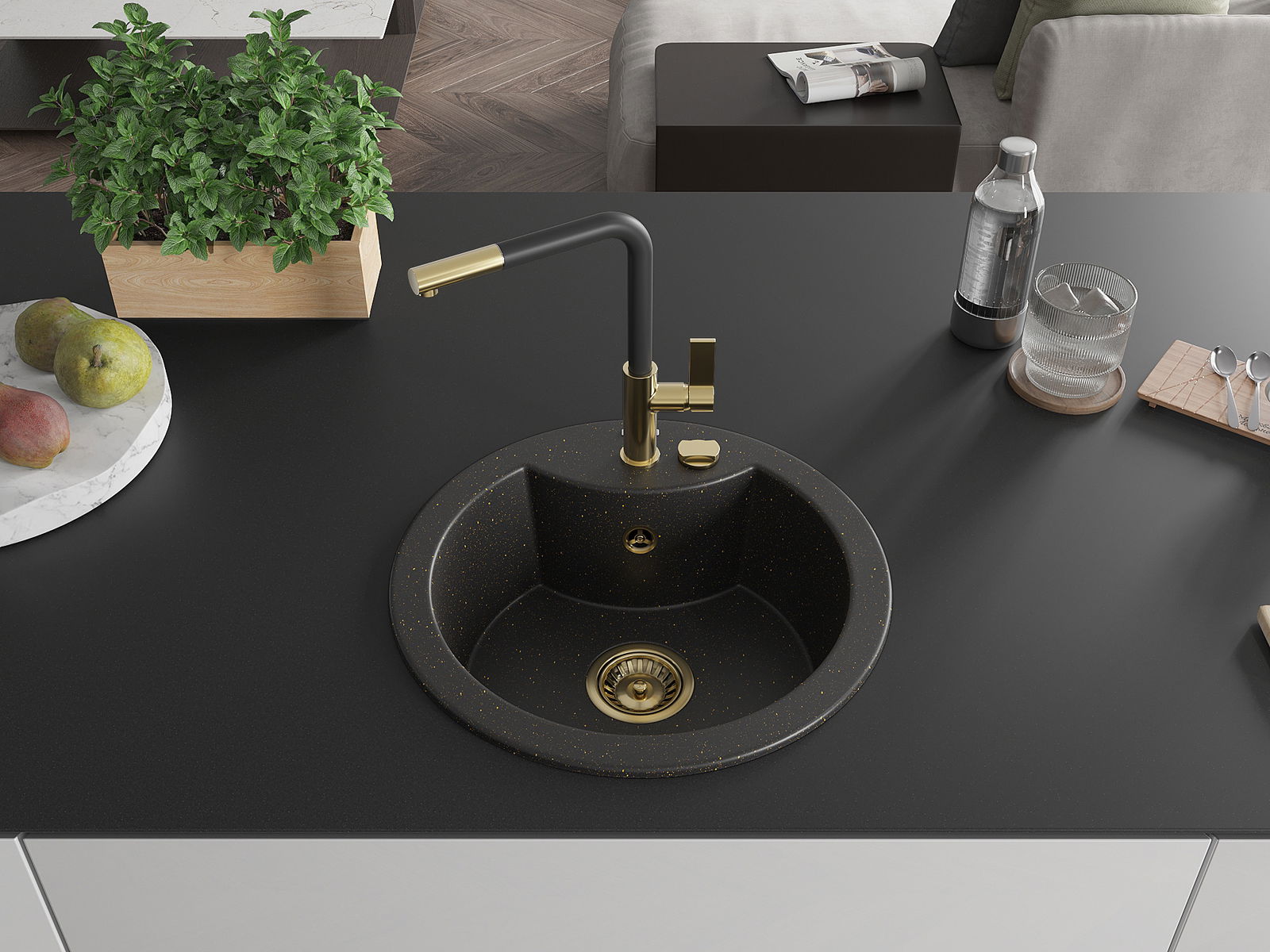Mexen Diego granito plautuvė 1-komorų su Flora virtuviniu maišytuvu, juoda/auksinė metalik - 6512-75-670401-57-G