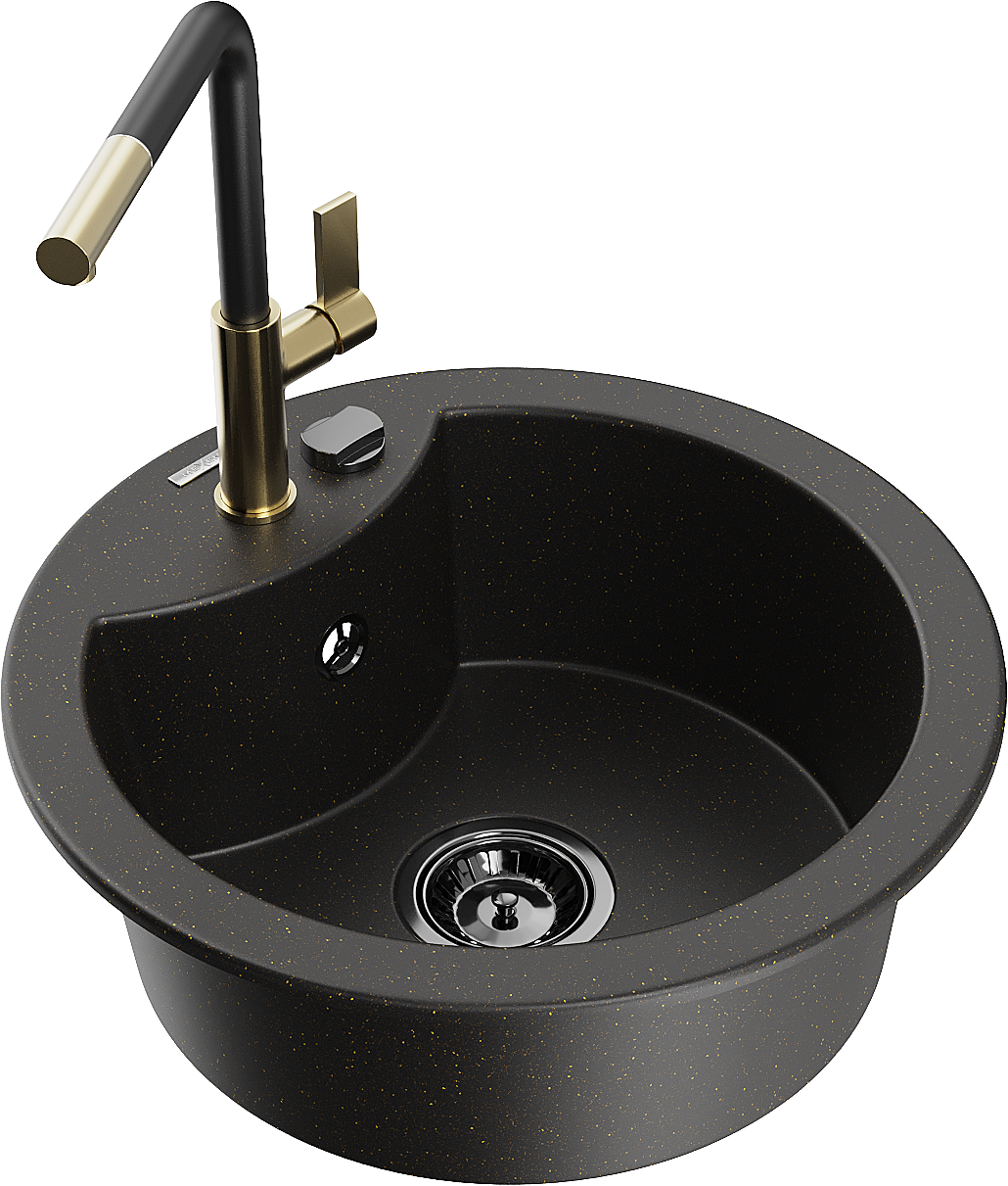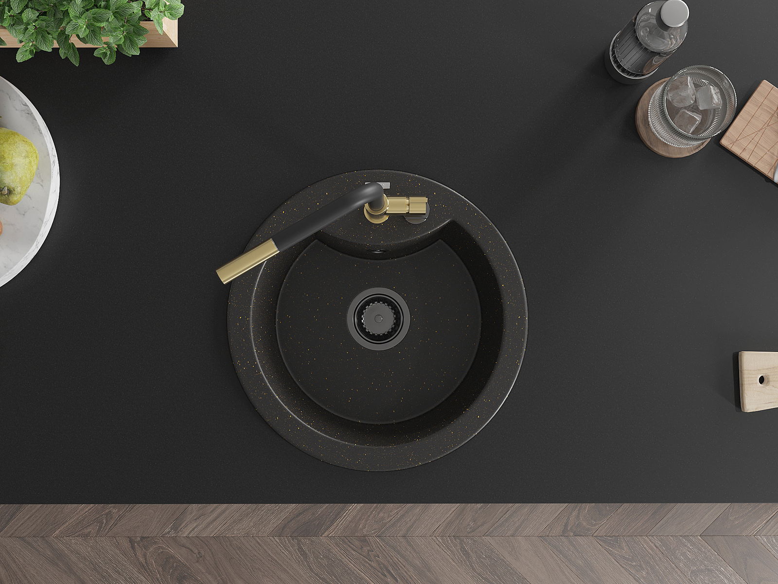 Mexen Diego vienos kameros granitinė plautuvė su Flora virtuviniu maišytuvu, juoda/auksinė metalo spalva - 6512-75-670401-57-B