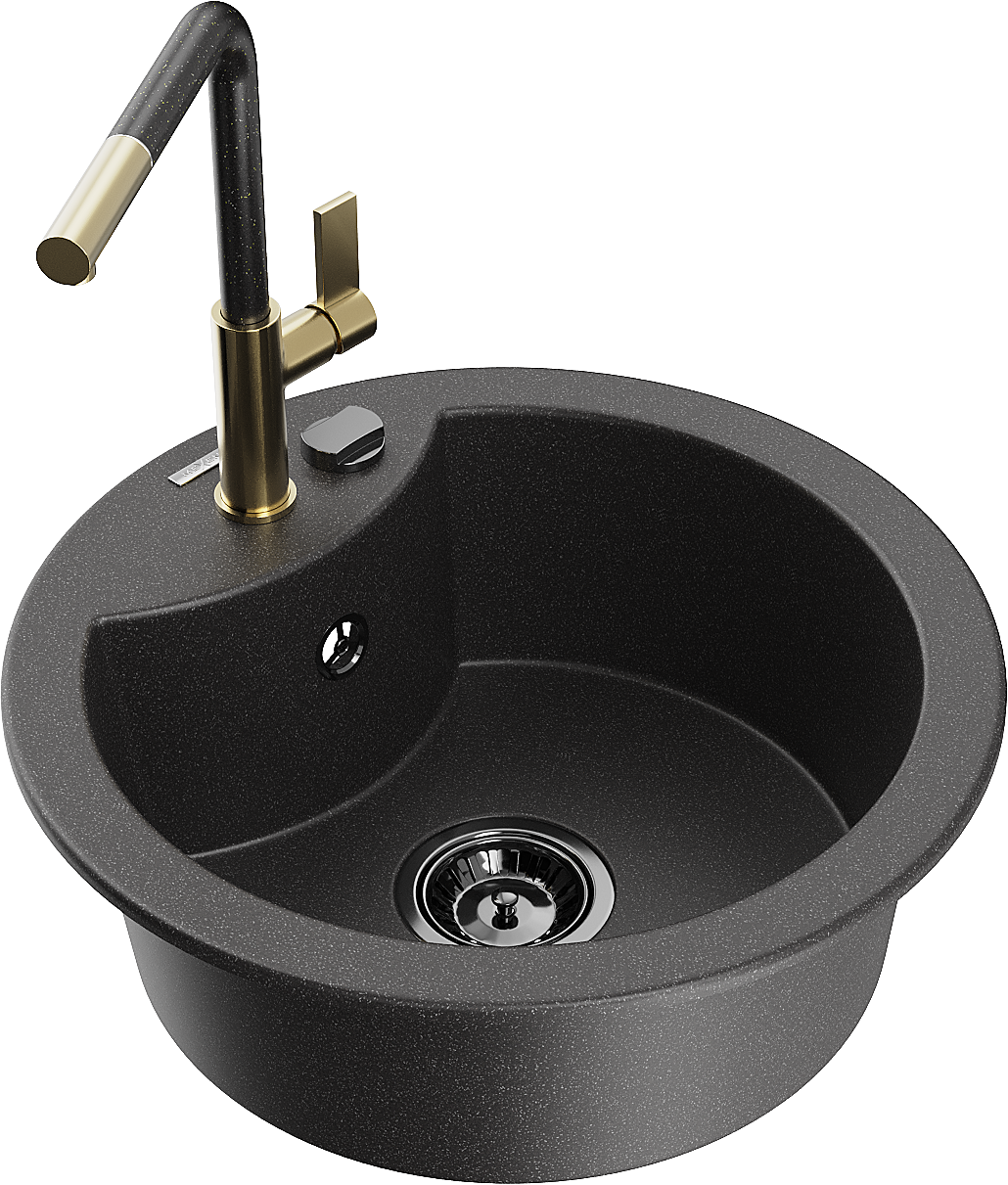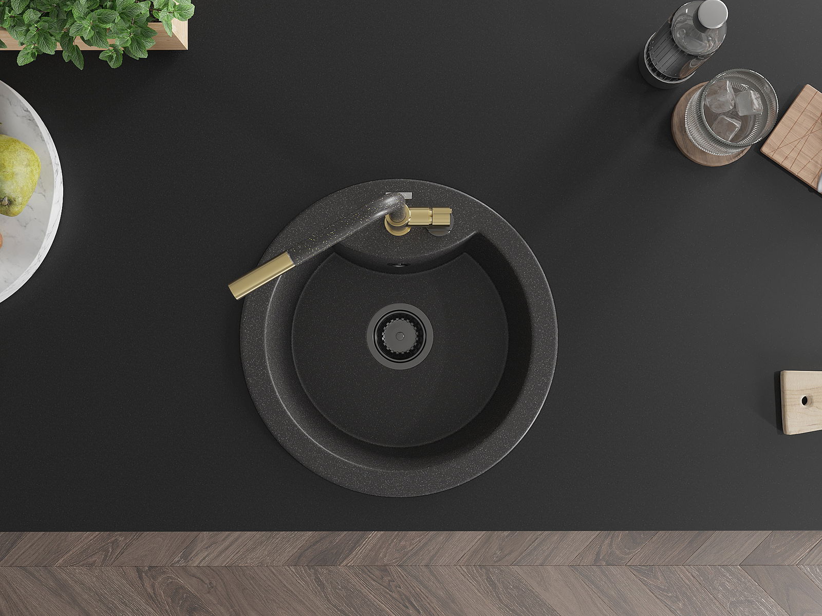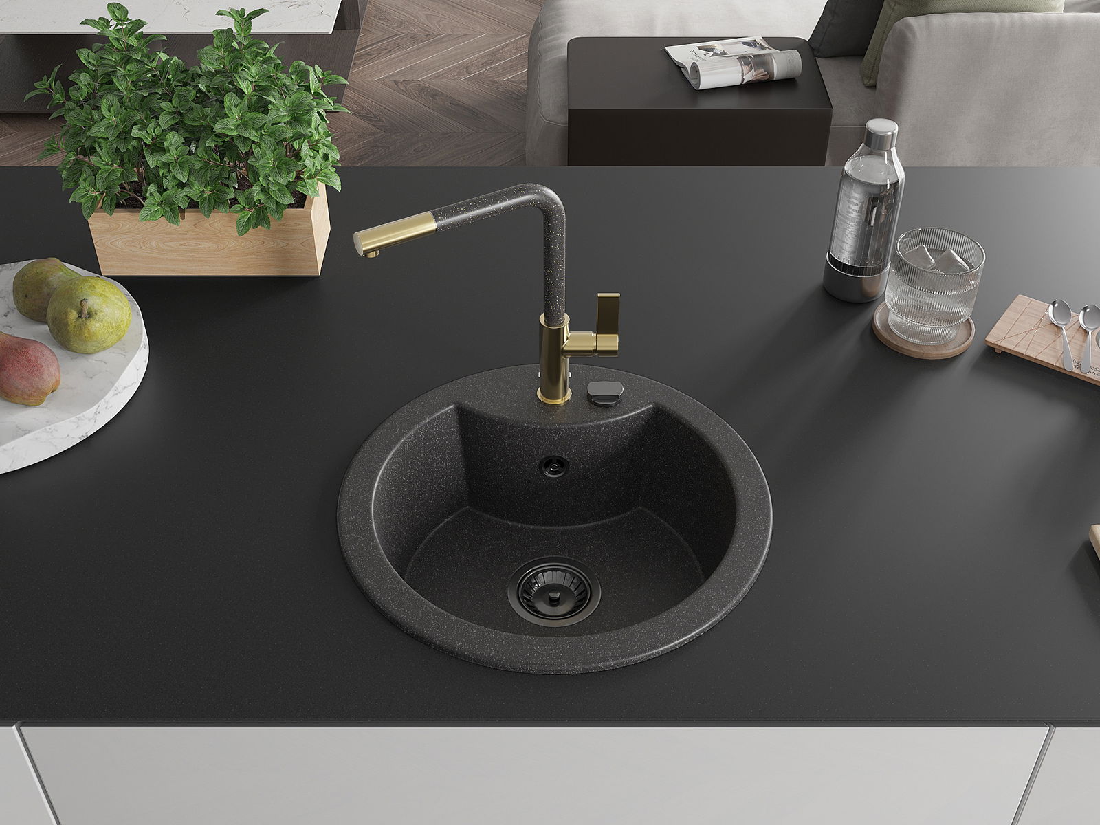 Mexen Diego granito plautuvė vienos kameros su Flora virtuviniu maišytuvu, juoda taškuota - 6512-76-670401-75-B