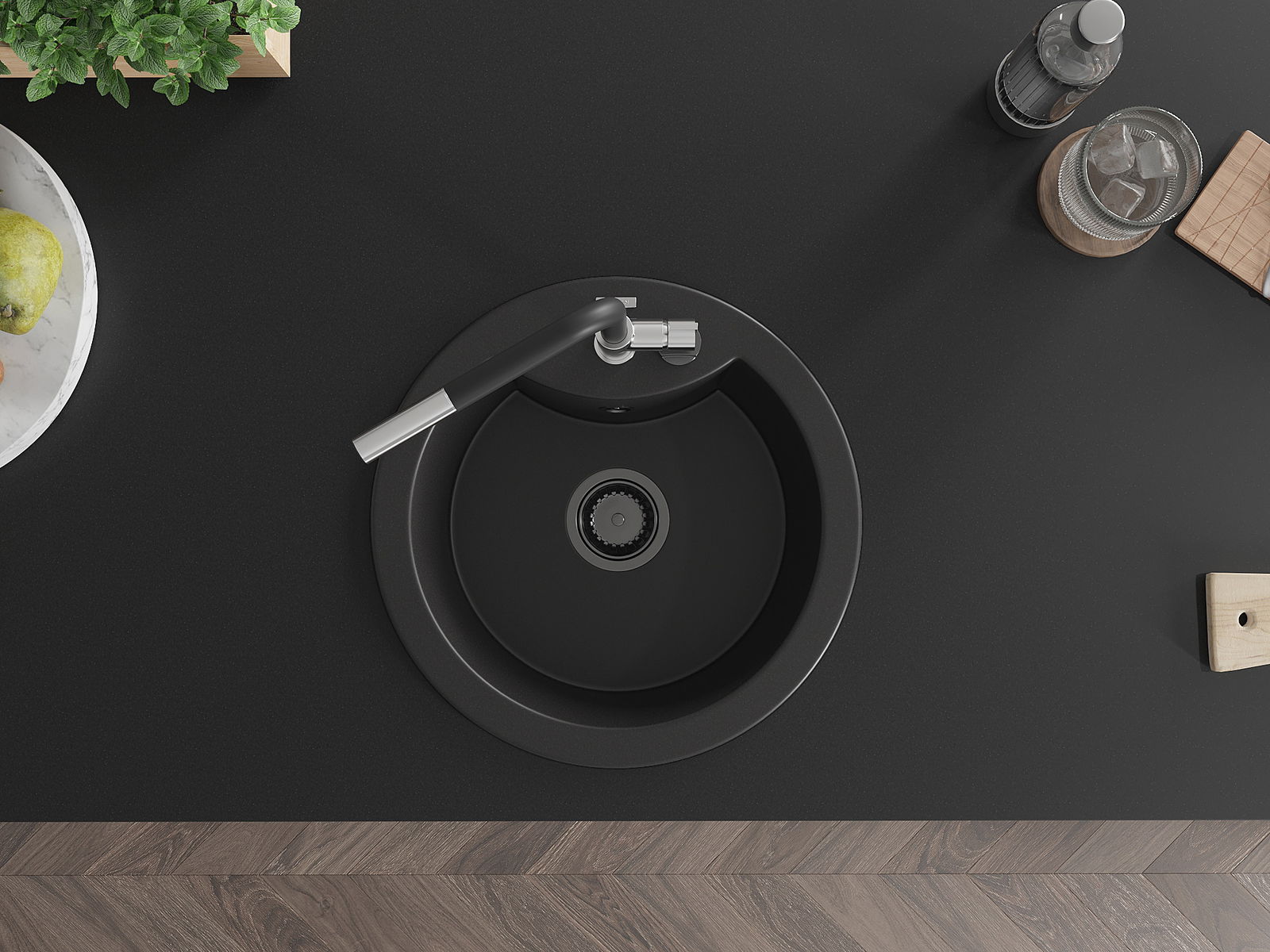 Mexen Diego 1 skyriujeo granitinė virtuvės plautuvė su Flora maišytuvu, juoda - 6512-77-670401-07-B