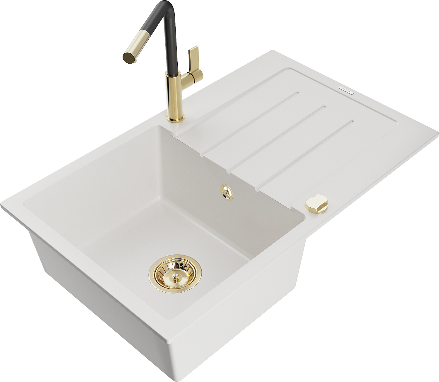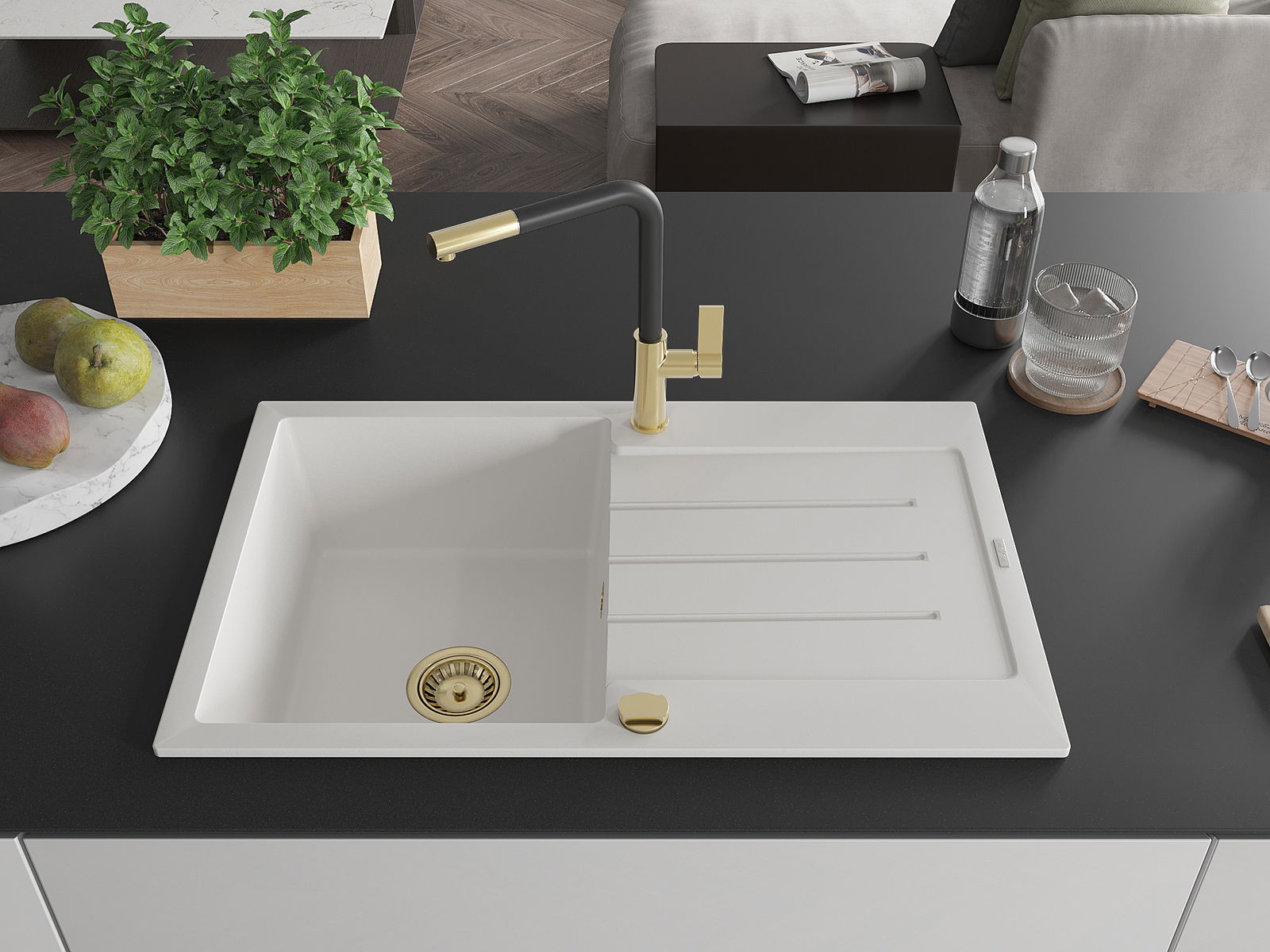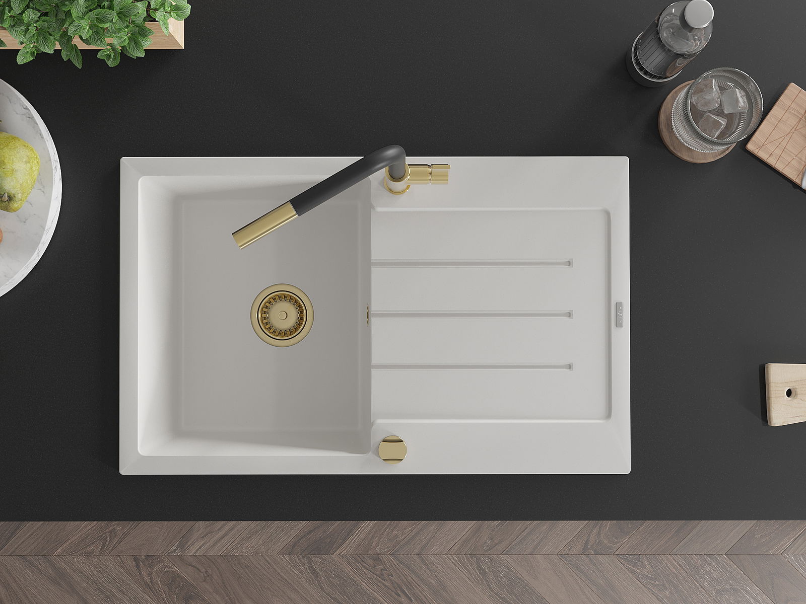 Mexen Bruno vientisas granitinis plautuvas su nutekėjimo plokšte ir virtuviniu maišytuvu Flora, baltas - 6513-20-670401-57-G