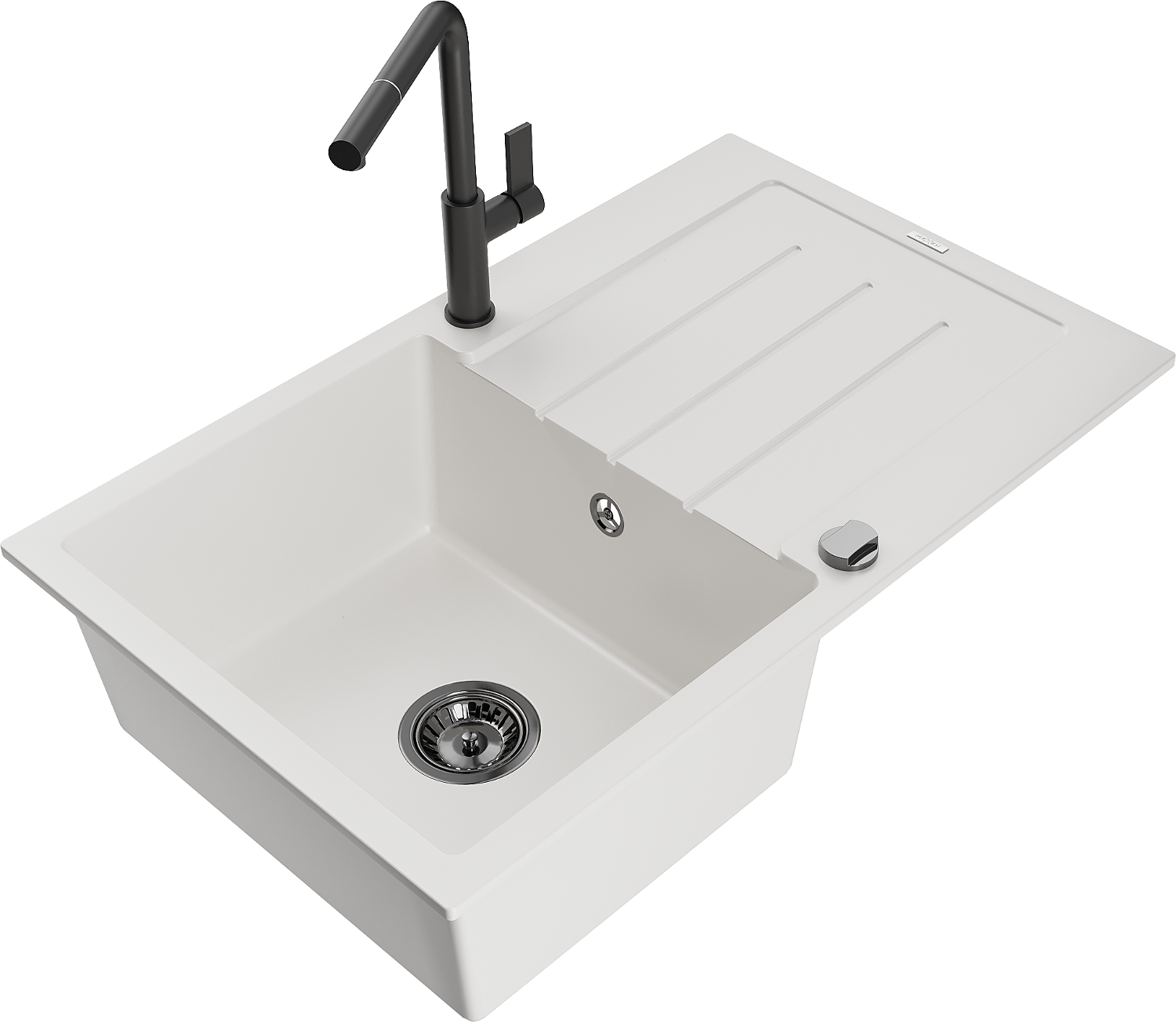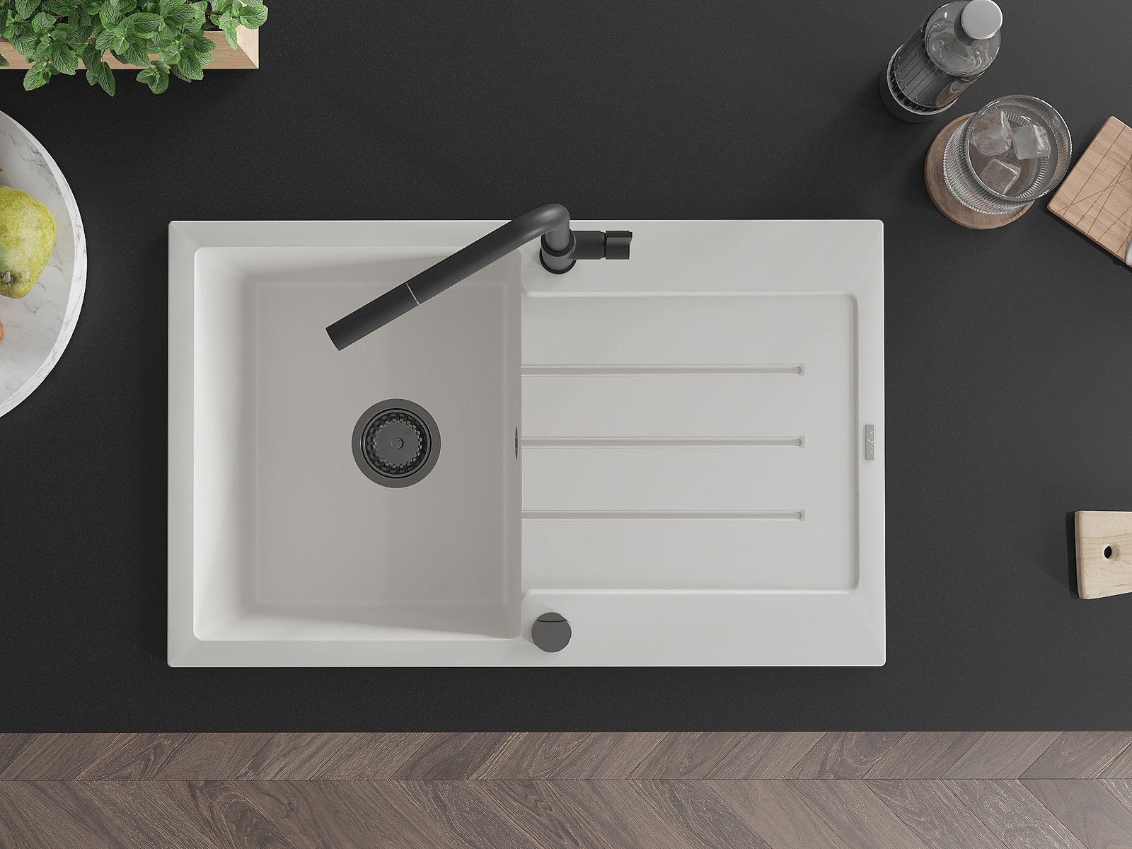 Mexen Bruno vienos dubenės granitinis plautuvas su drenažu ir virtuviniu maišytuvu Flora, baltas - 6513-20-670401-70-B
