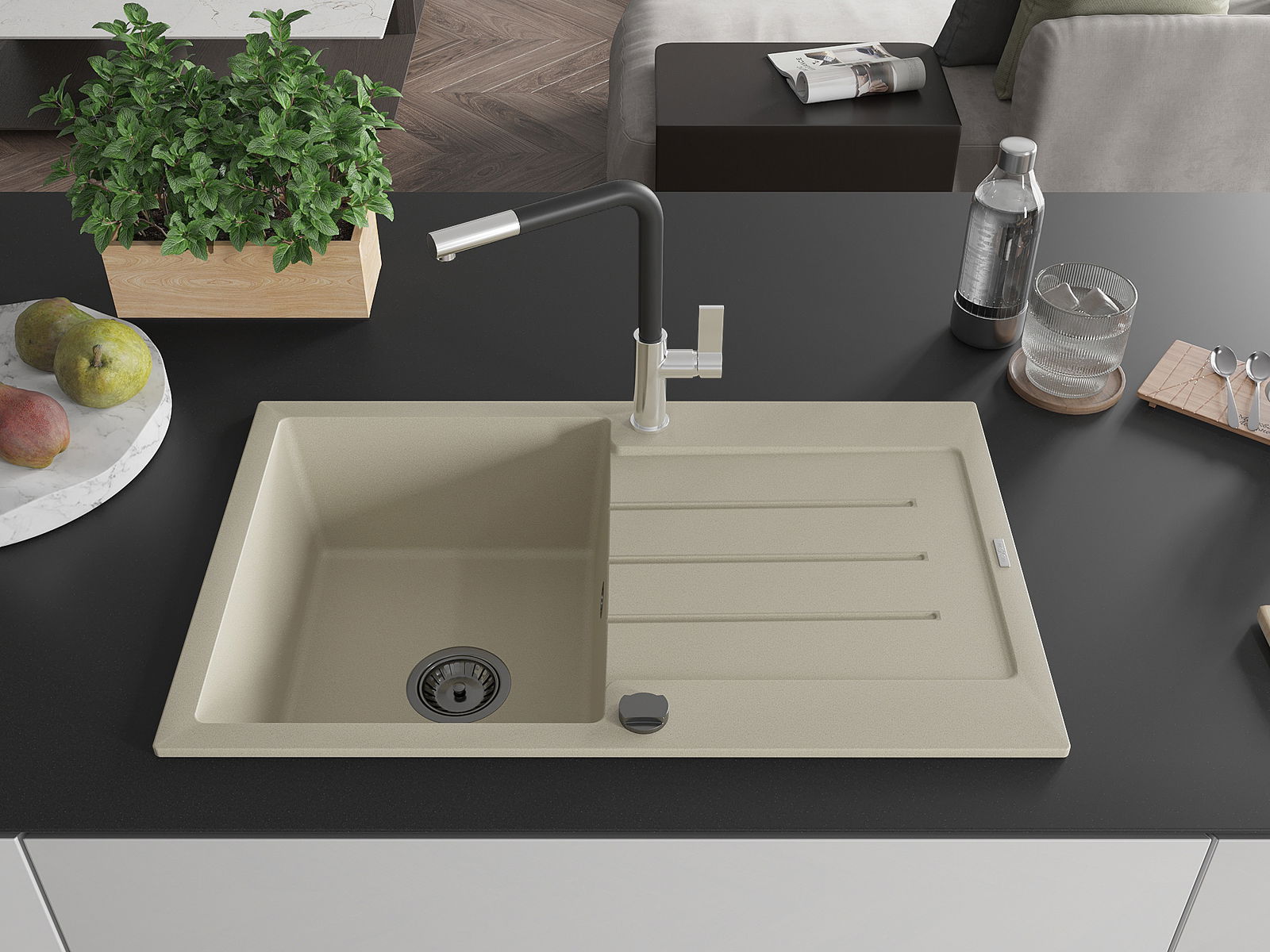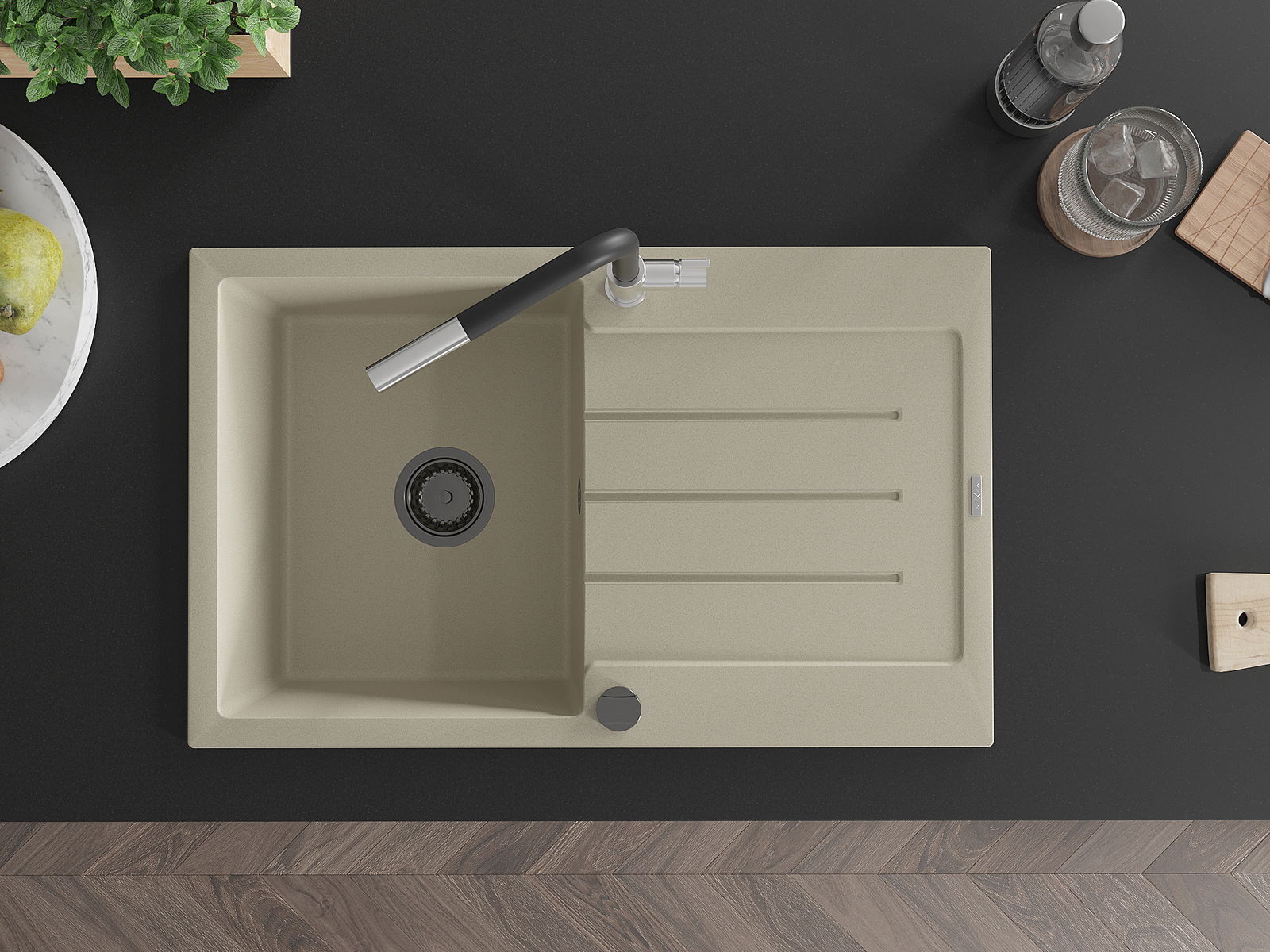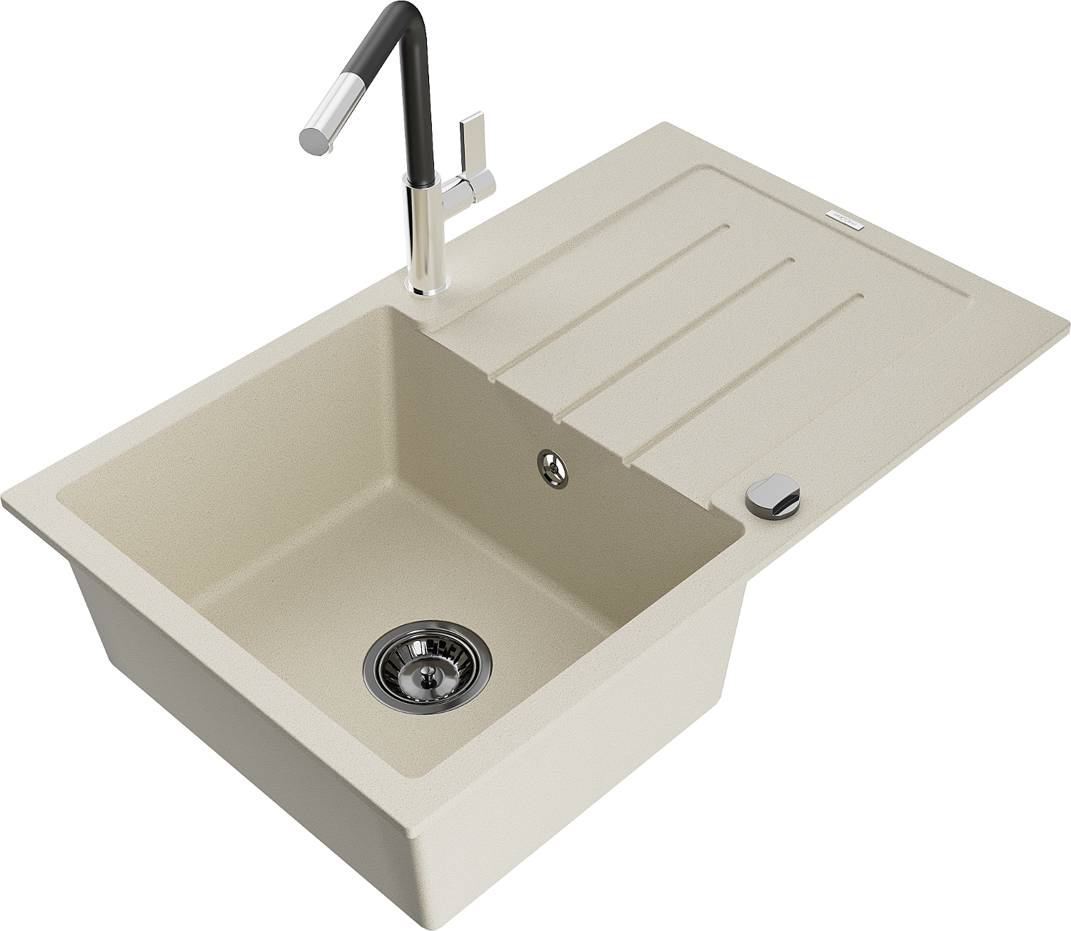 Mexen Bruno granitinė vienos kameros kriauklė su drenažu ir Flora virtuviniu maišytuvu, smėlio spalvos - 6513-69-670401-07-B