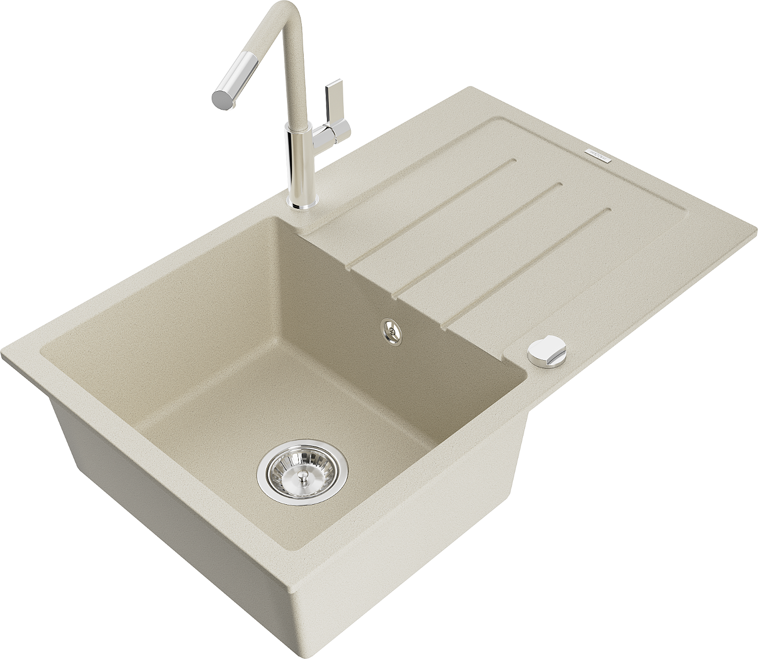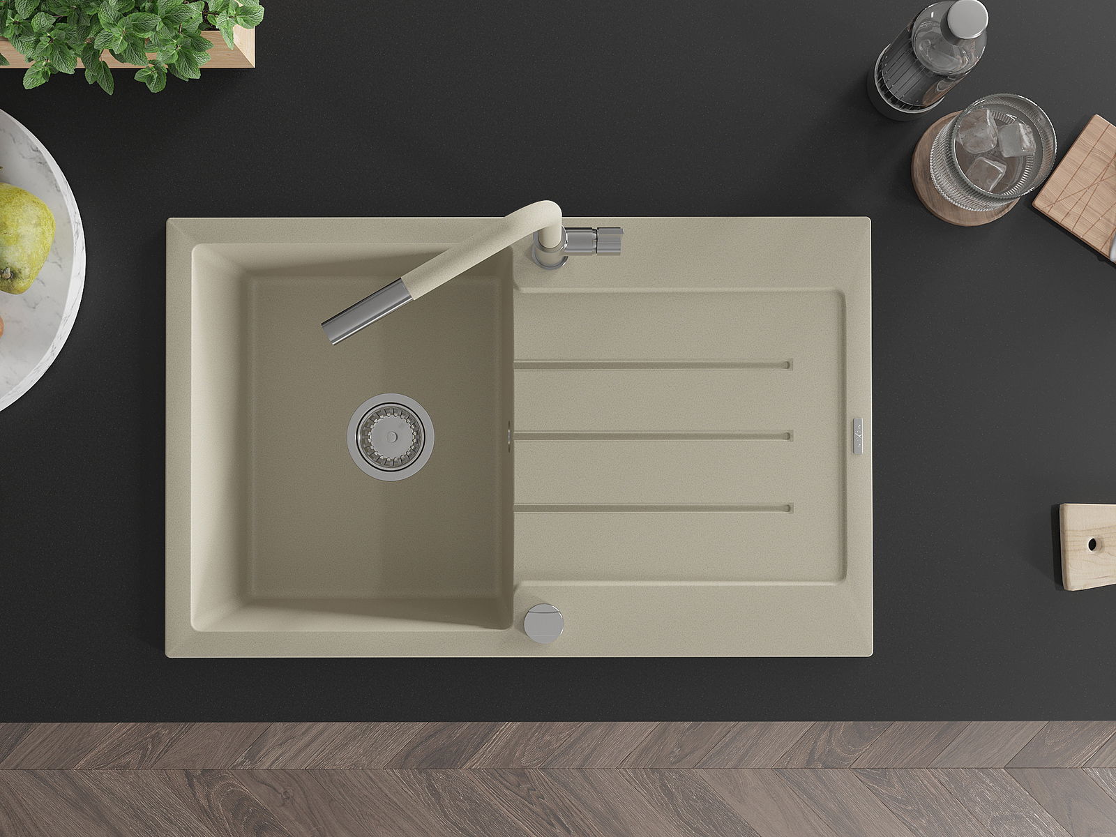 Mexen Bruno vienos kameros granitinė kriauklė su nusausintuvu ir virtuviniu maišytuvu Flora, smėlio spalvos