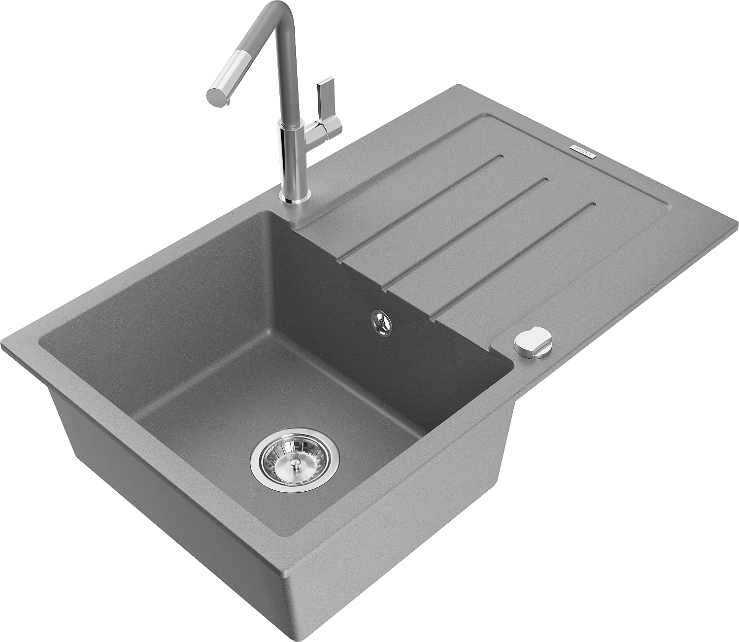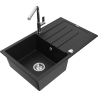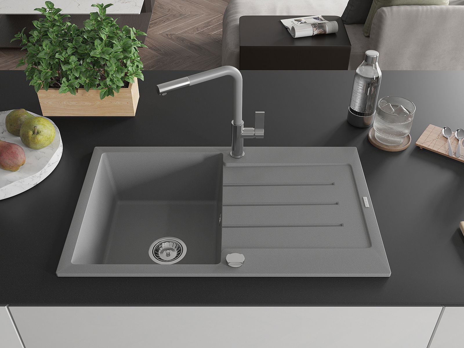 Mexen Bruno granitinis kriauklė su 1 skyriumi ir nutekėjimu bei virtuviniu maišytuvu Flora, pilkas - 6513-71-670401-06