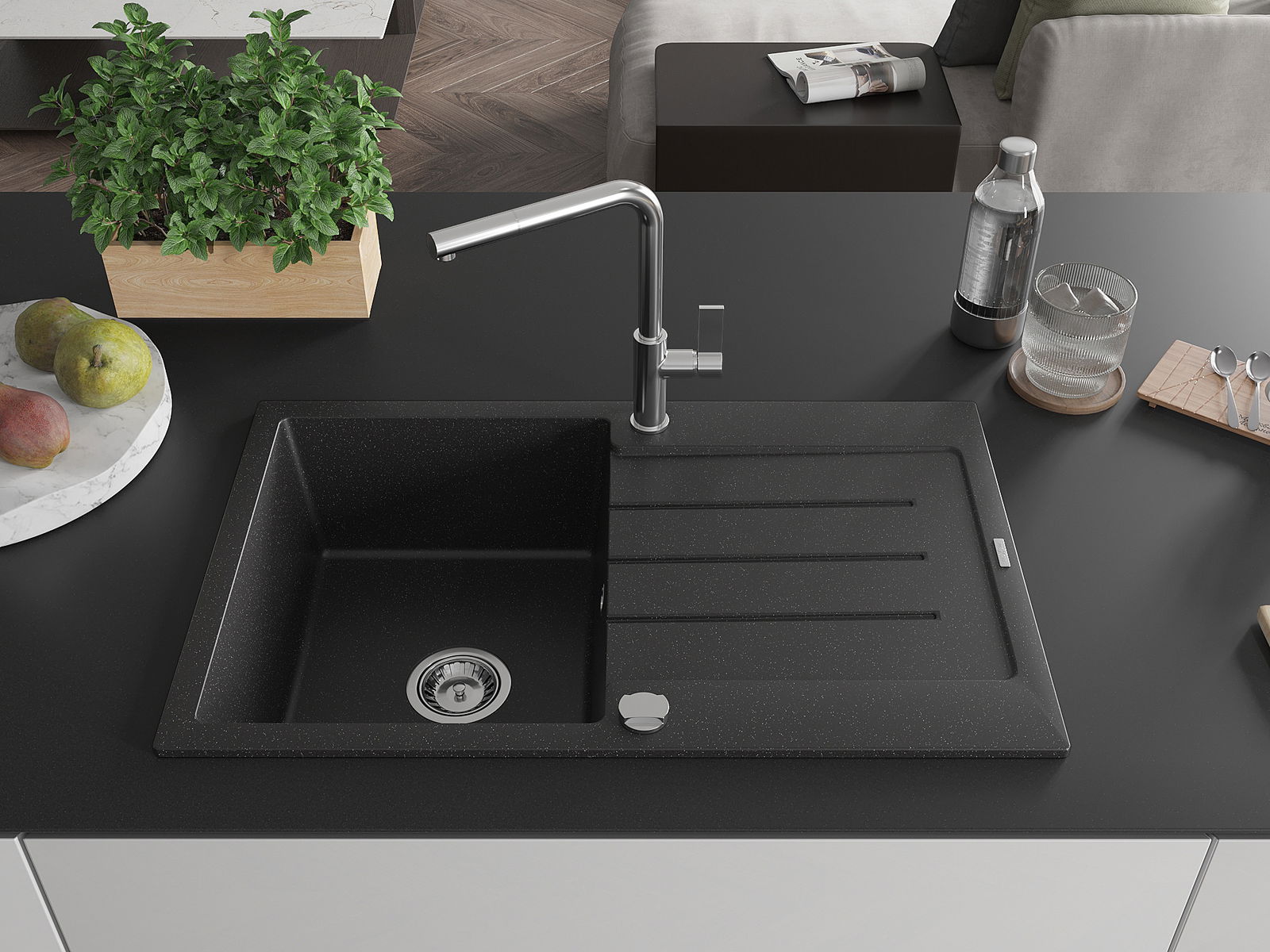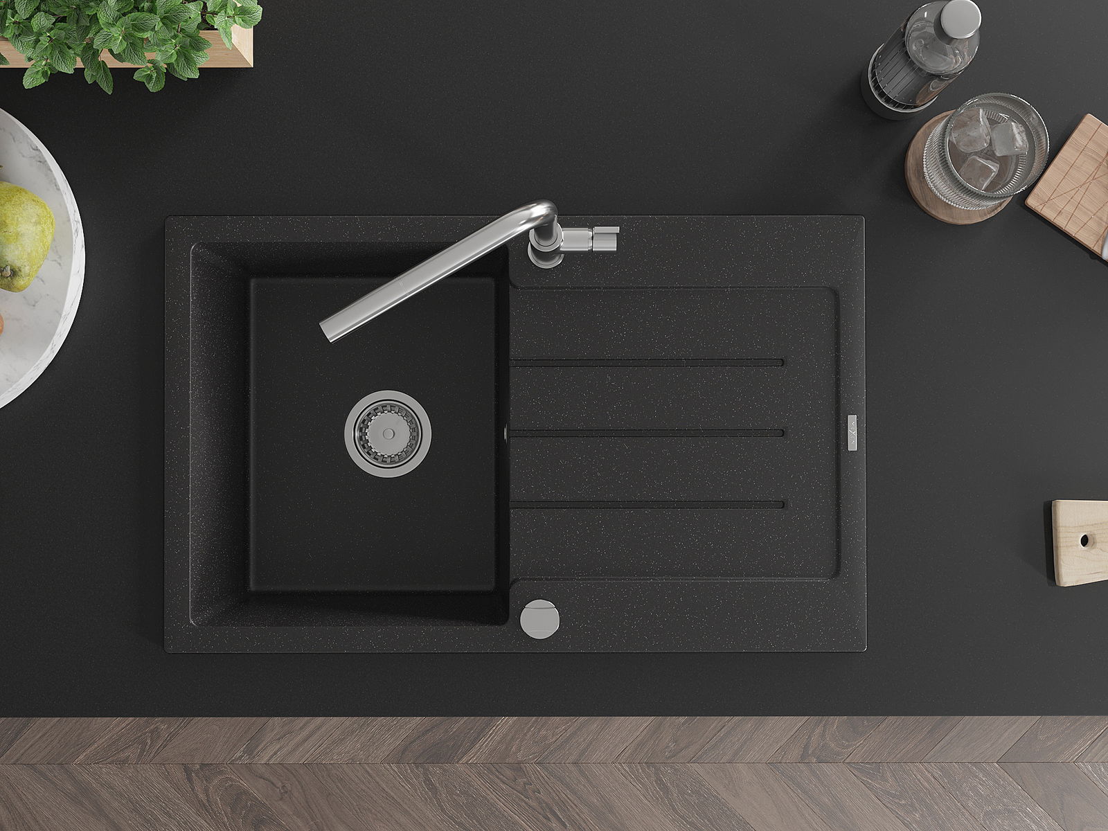 Mexen Bruno 1 skyrius granitinis plautuvas su nusausinimo ir Flora virtuviniu maišytuvu, juoda/sidabrinė metalika
