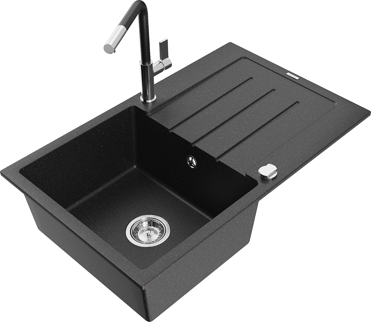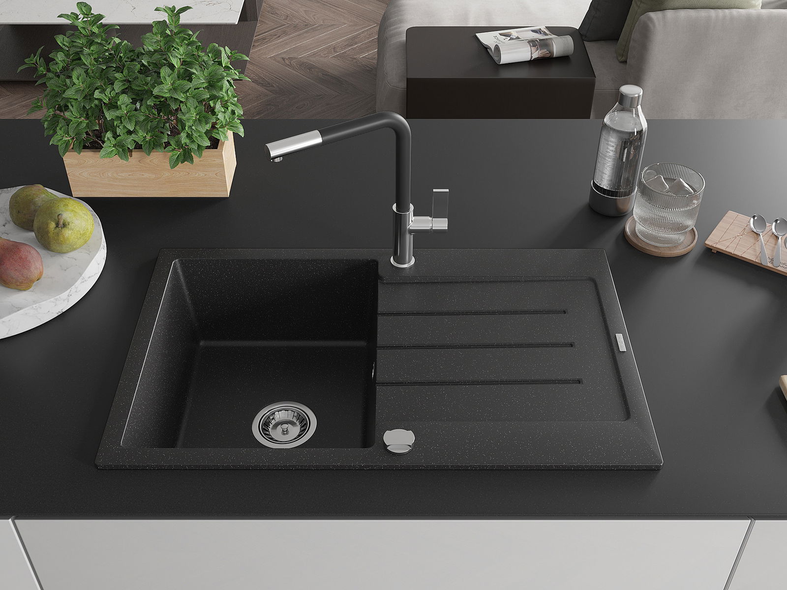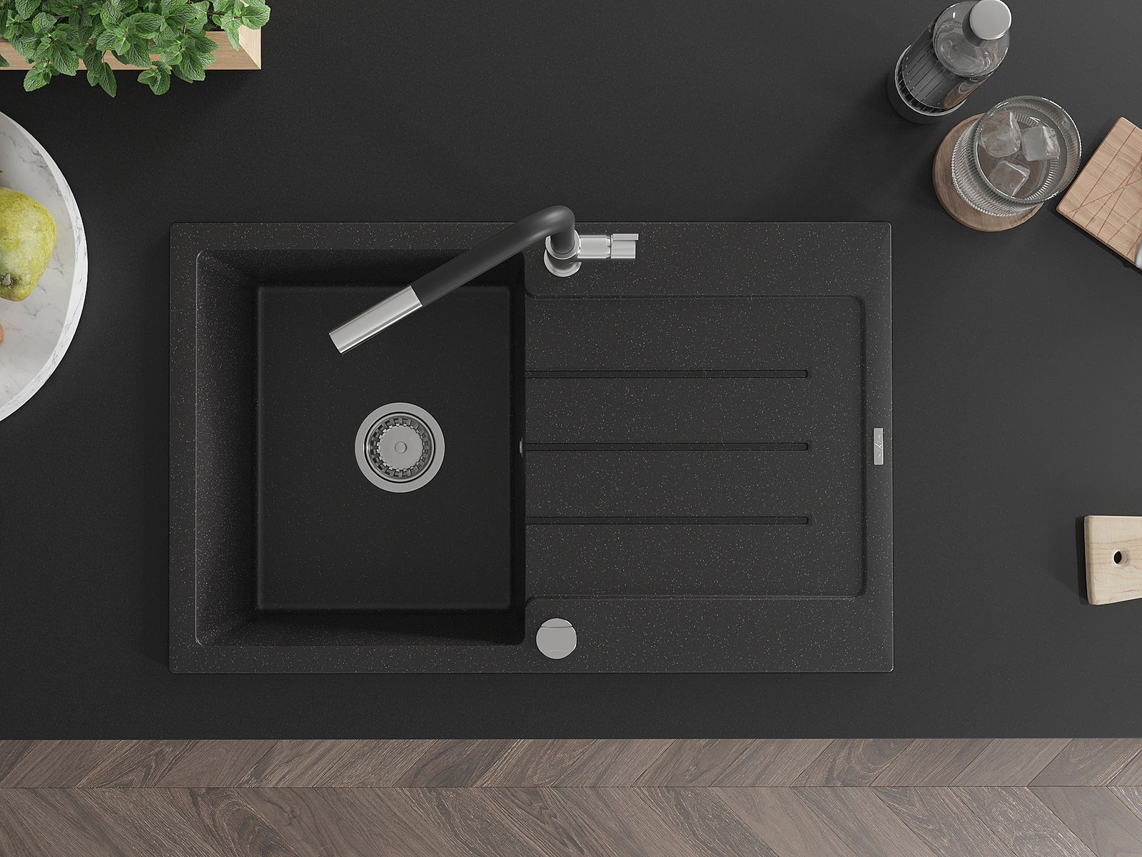 Mexen Bruno granito plautuvė 1 skyriumi su nutekėjimu ir virtuviniu maišytuvu Flora, juoda/sidabrinė metalikas