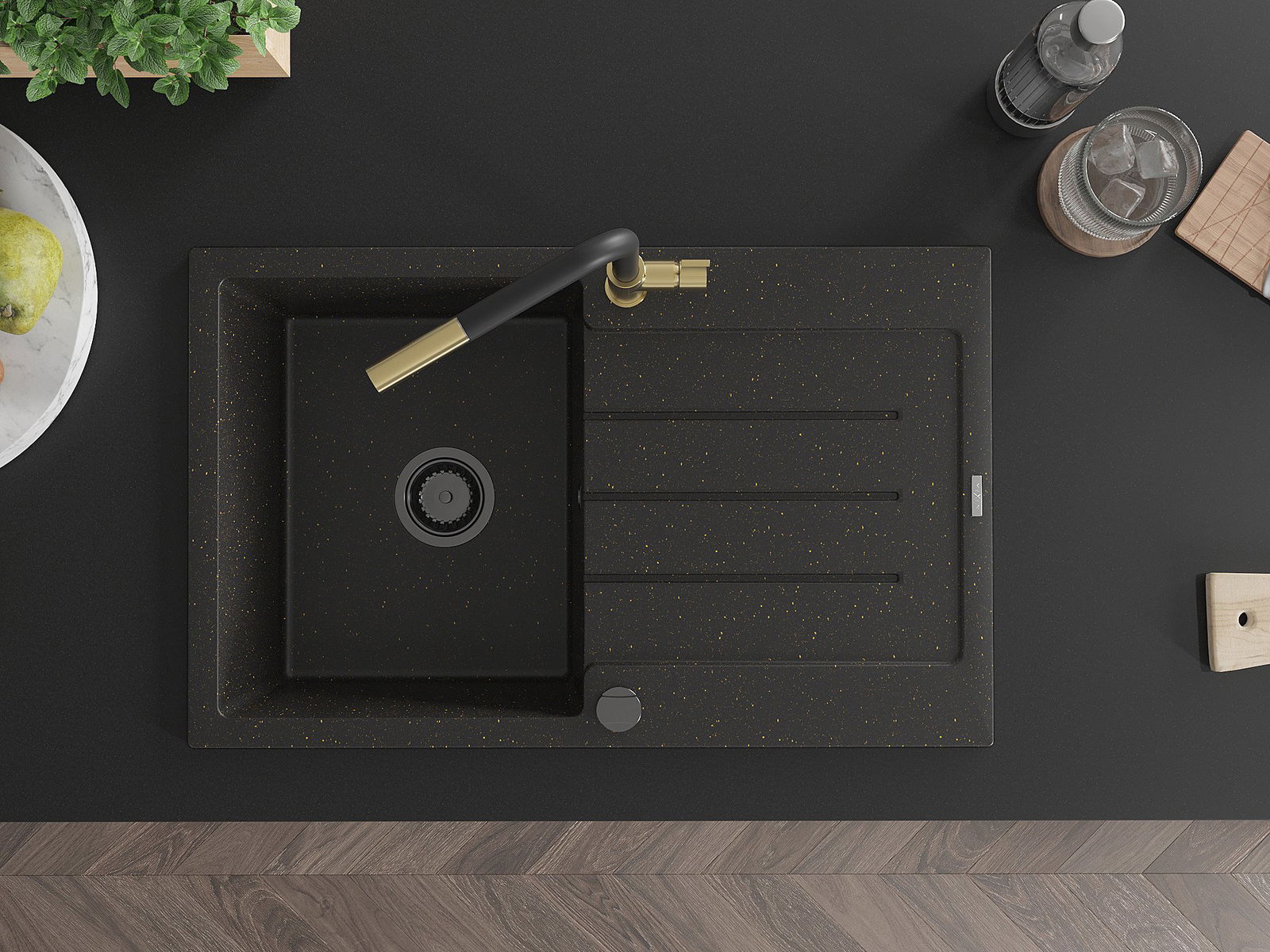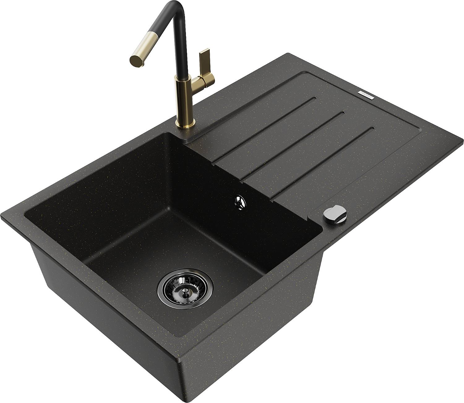 Mexen Bruno granitinė vienos kameros plautuvė su džiovykle ir virtuviniu maišytuvu Flora, juoda/auksinė metalizuota - 6513-75-6?