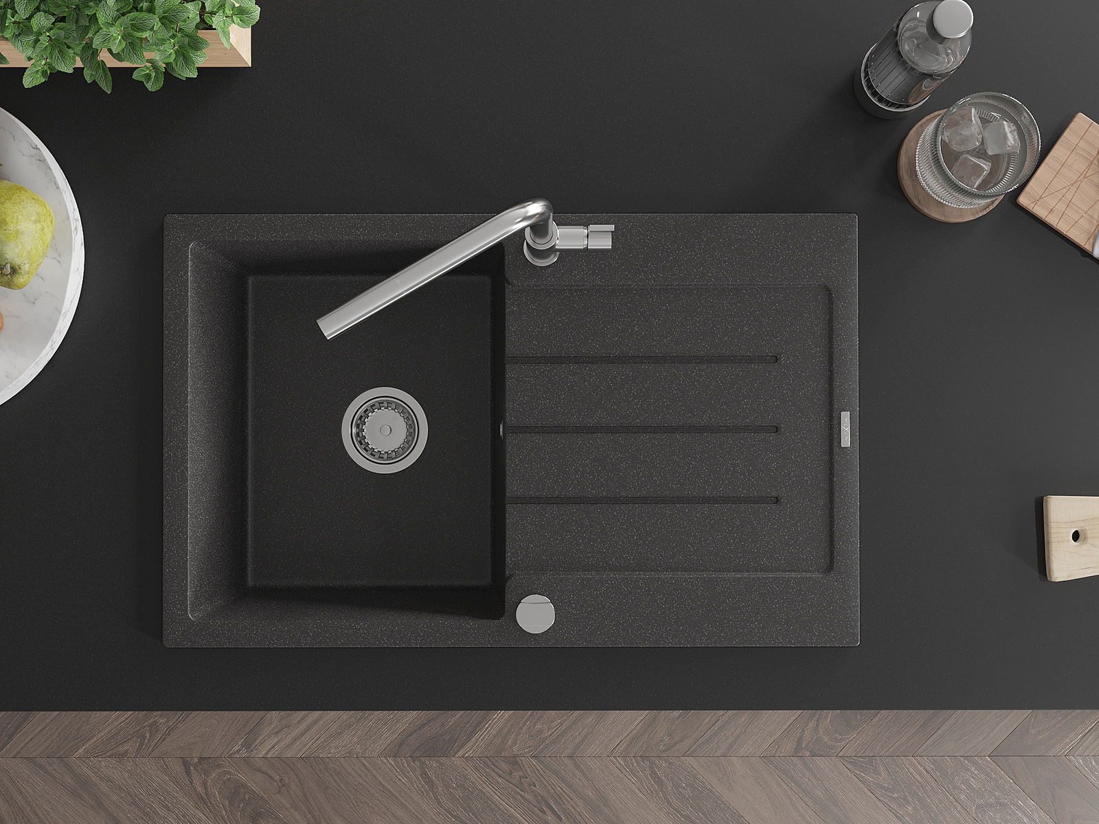 Mexen Bruno grindinis granito plautuvas su viena kamera, lašėjimas ir Flora virtuvės maišytuvas, juodas su taškeliais