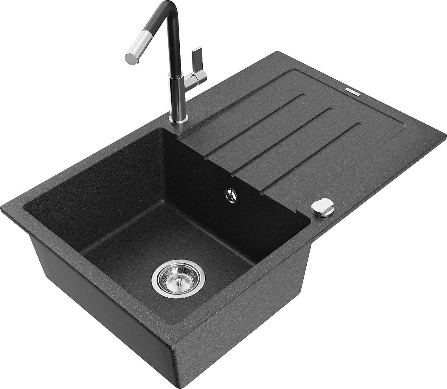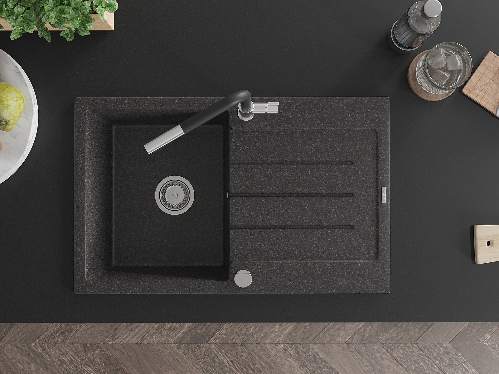 Mexen Bruno vienos dubens granitinė plautuvė su lašeline ir Flora virtuviniu maišytuvu, juodas dėmėtas - 6513-76-670401-07