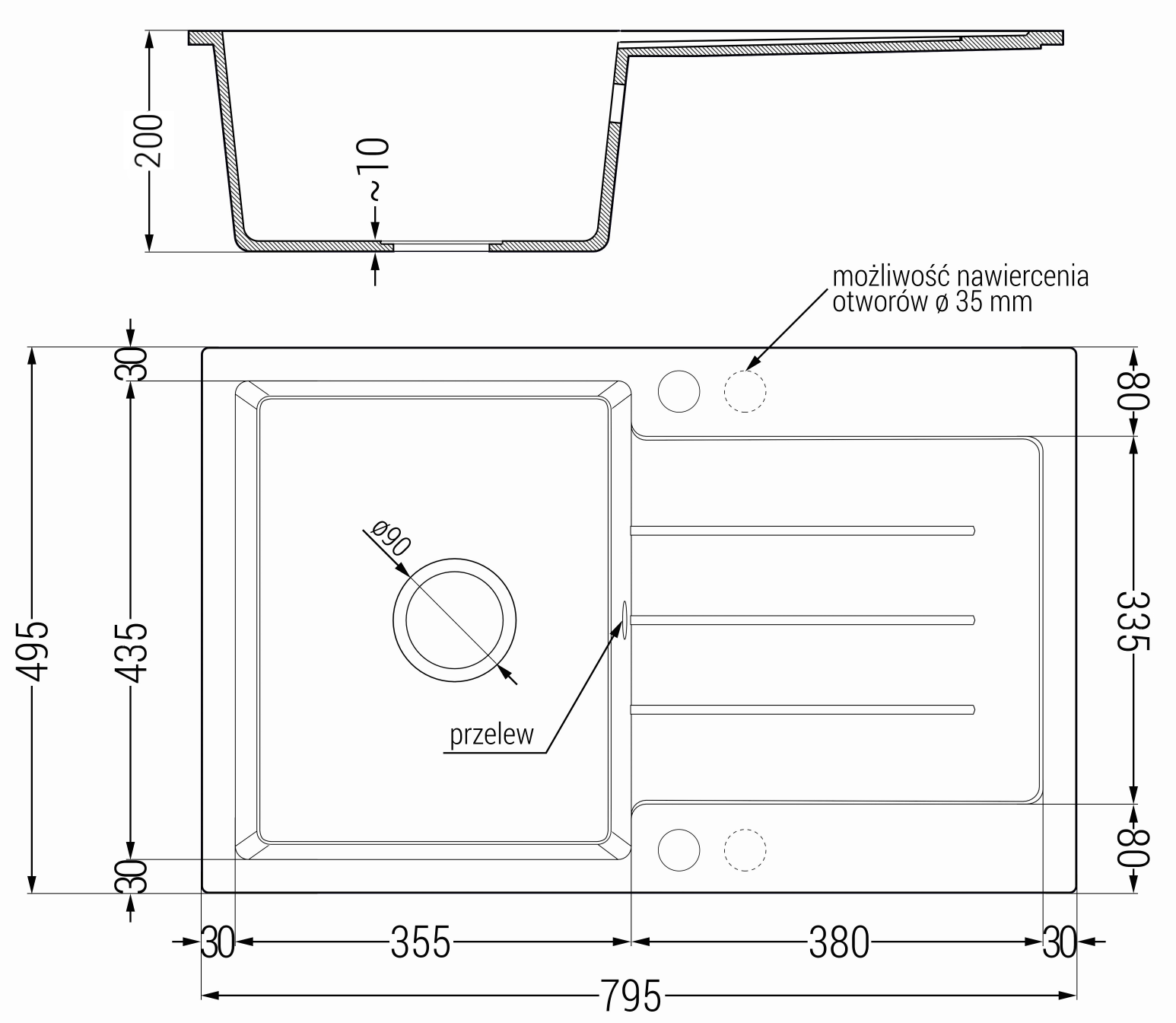 Kriauklė turi 2 iš anksto frezuotas skyles, kurių skersmuo yra 35 mm, skirtas savarankiškam išmušimui. Jas galima naudoti, pavyzdžiui, skysčio dozatoriaus montavimui, kuris pašalins plastikinių butelių buvimą virtuvėje ir suteiks jai elegantišką apdailą.