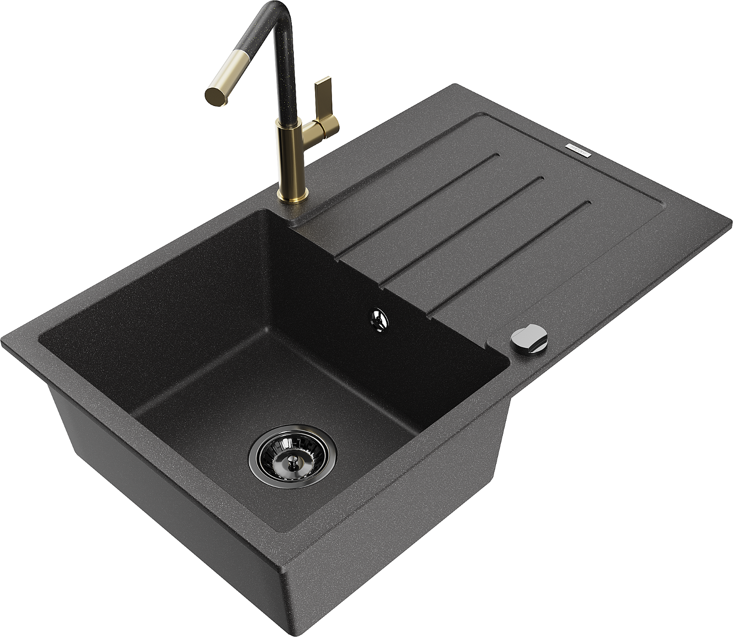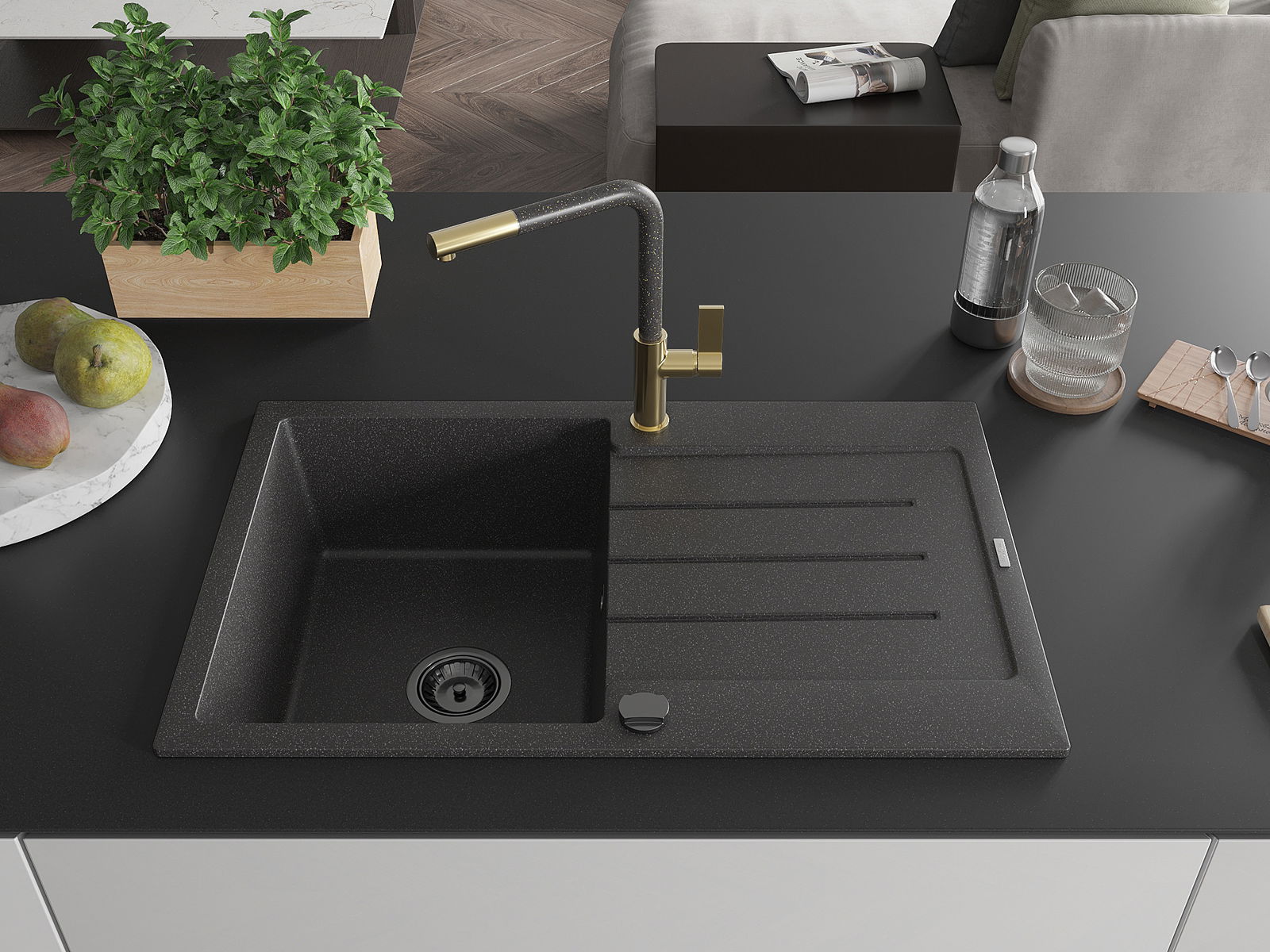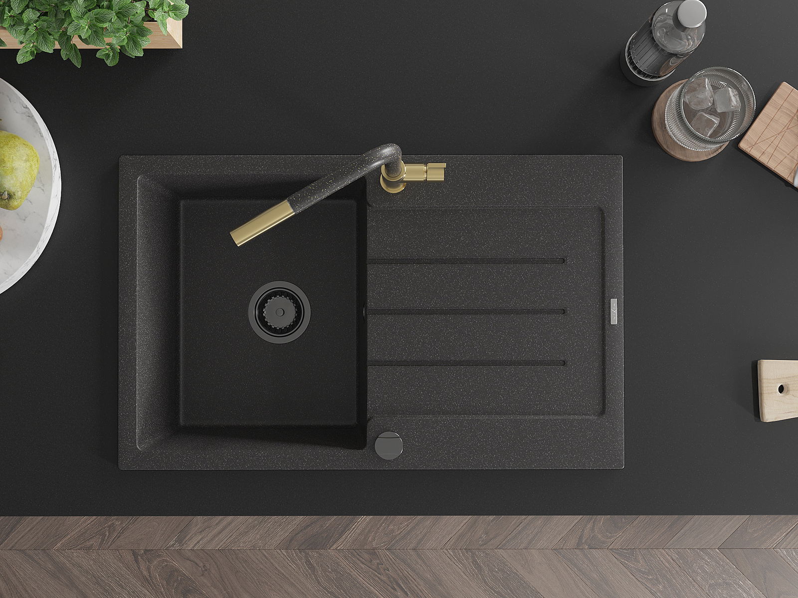 Mexen Bruno granitinė vienaaukštė plautuvė su nusausintoju ir virtuviniu Flora maišytuvu, juodas su taškeliais