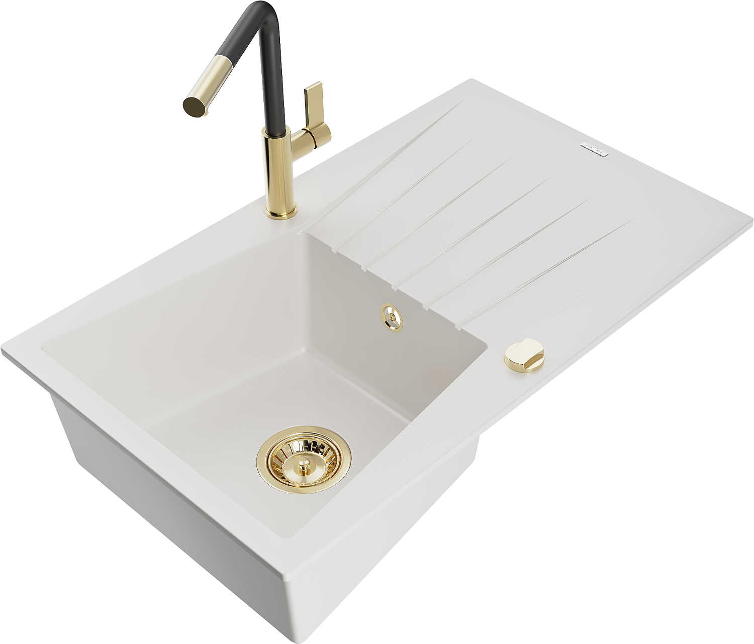 Mexen Cesar granito kriauklė su vienu dubeniu ir lataku bei virtuviniu maišytuvu Flora, balta - 6514-20-670401-57-G