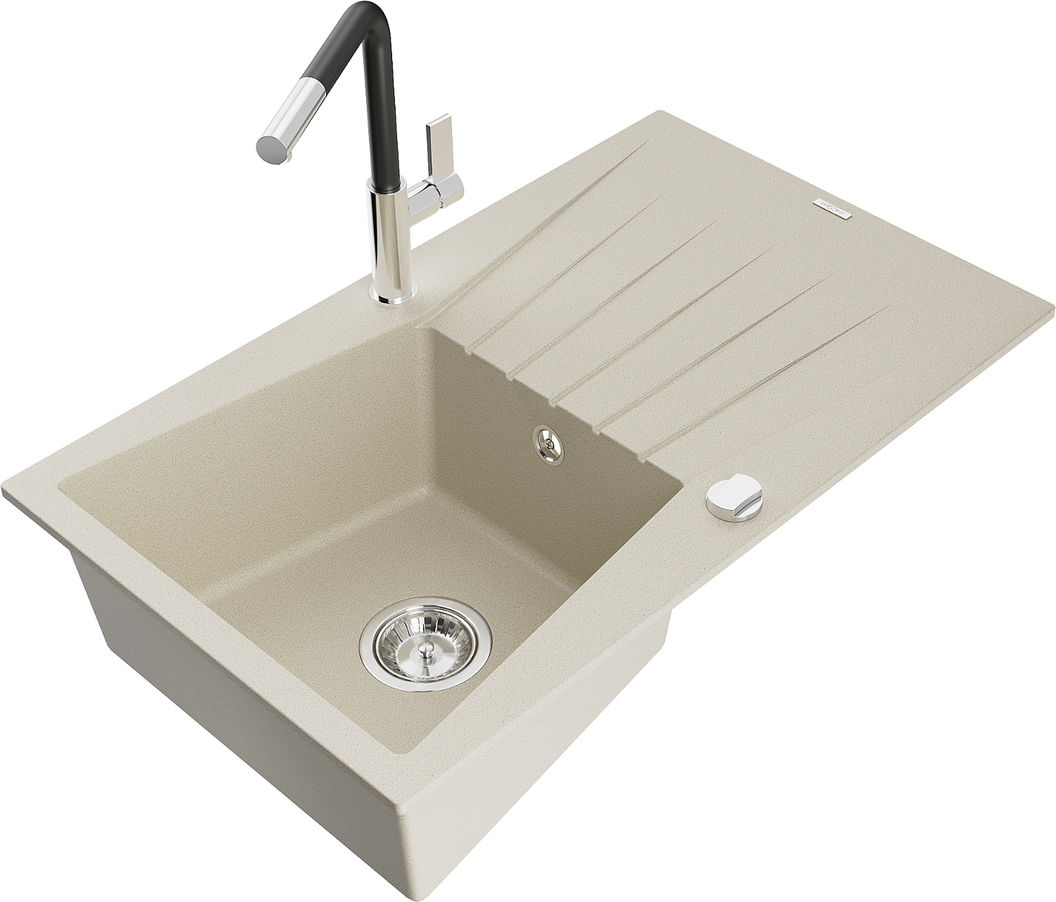 Mexen Cesar vienos kameros granitinė virtuvės kriauklė su nuvarvėjimo lentyna ir Flora maišytuvu, smėlio spalvos