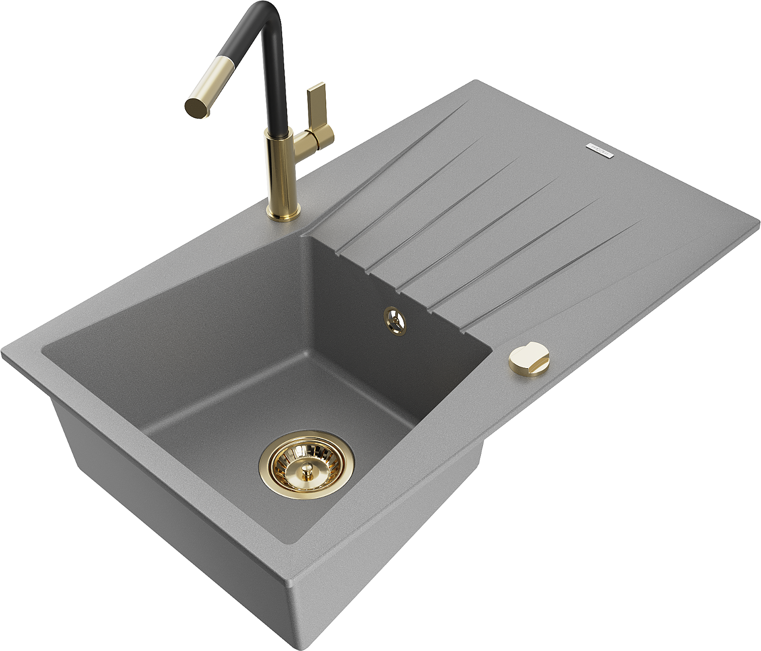 Mexen Cesar granito plautuvė su viena kamera ir nusausinimo lentyna bei virtuviniu maišytuvu Flora, pilka - 6514-71-670401-57-G