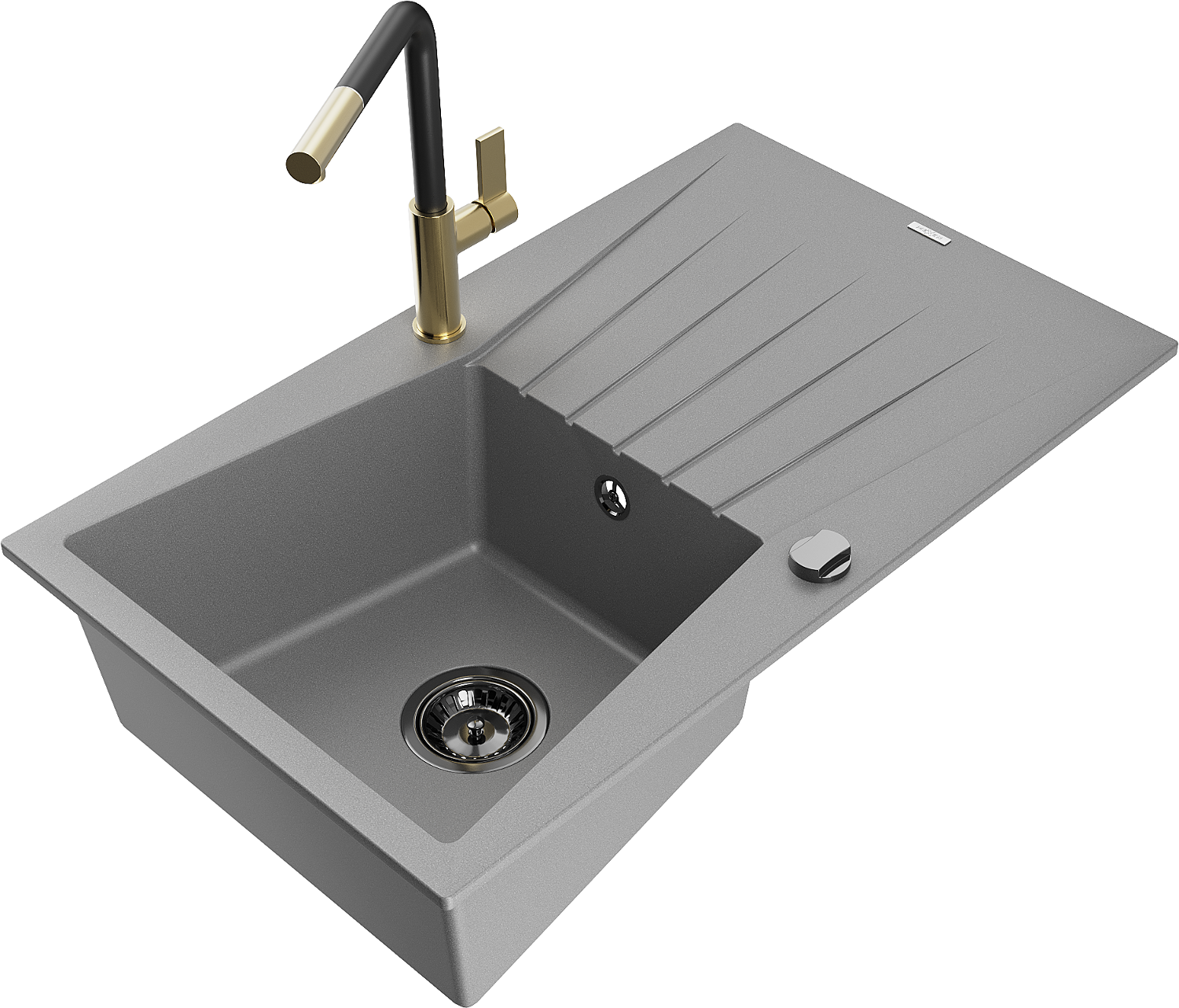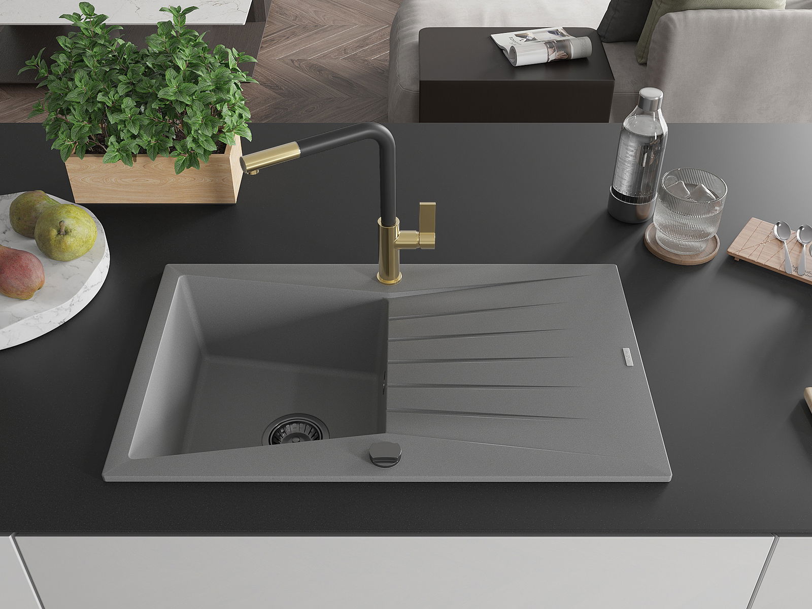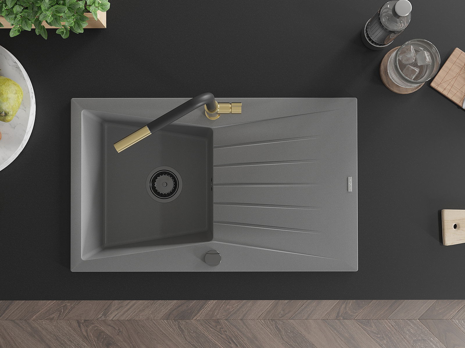 Mexen Cesar vienos kameros granito plautuvė su nutekamu ir Flora virtuvės maišytuvu, pilka - 6514-71-670401-57-B