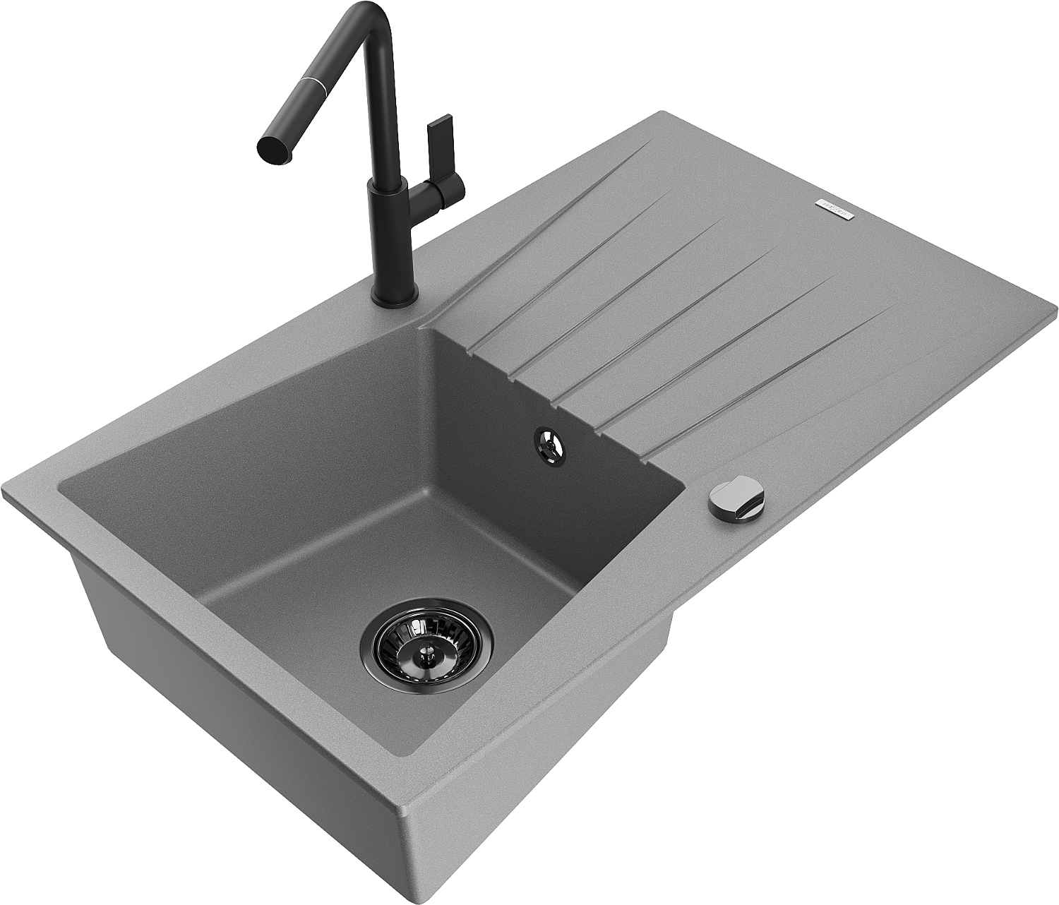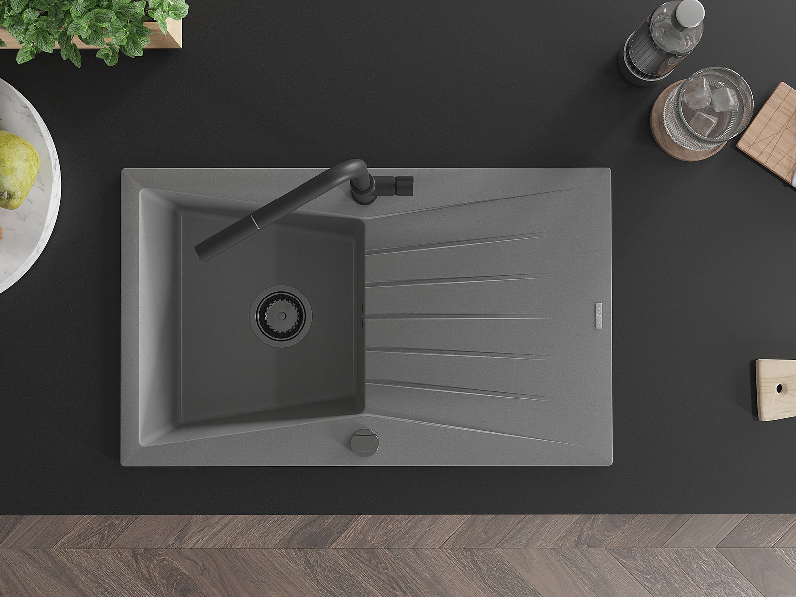 Mexen Cesar granito kriauklė su viena kamera, nutekamąja plokšte ir virtuviniu maišytuvu Flora, pilka - 6514-71-670401-70-B